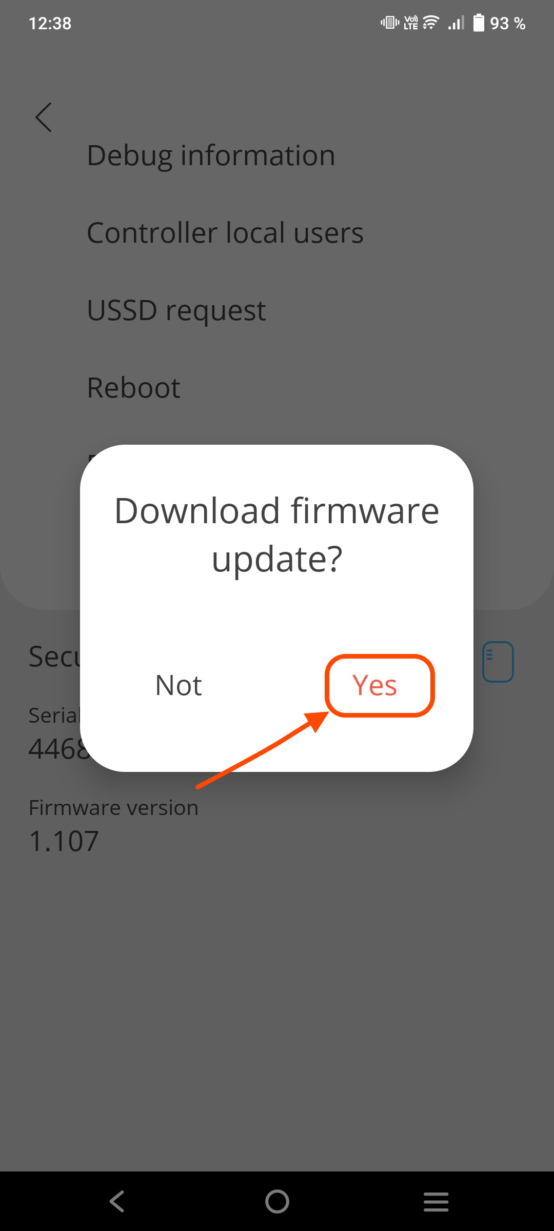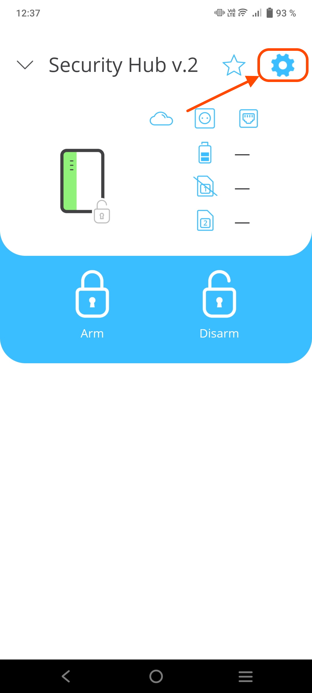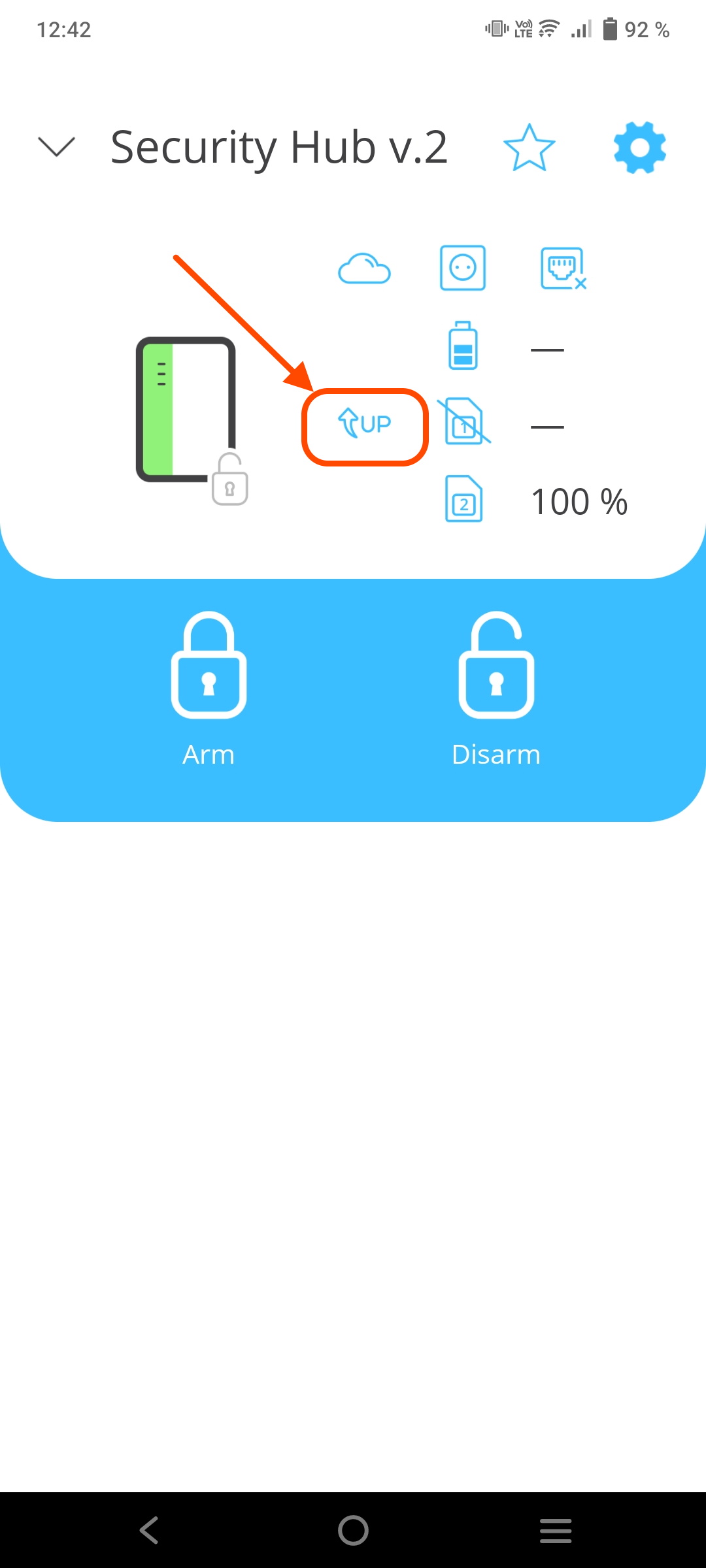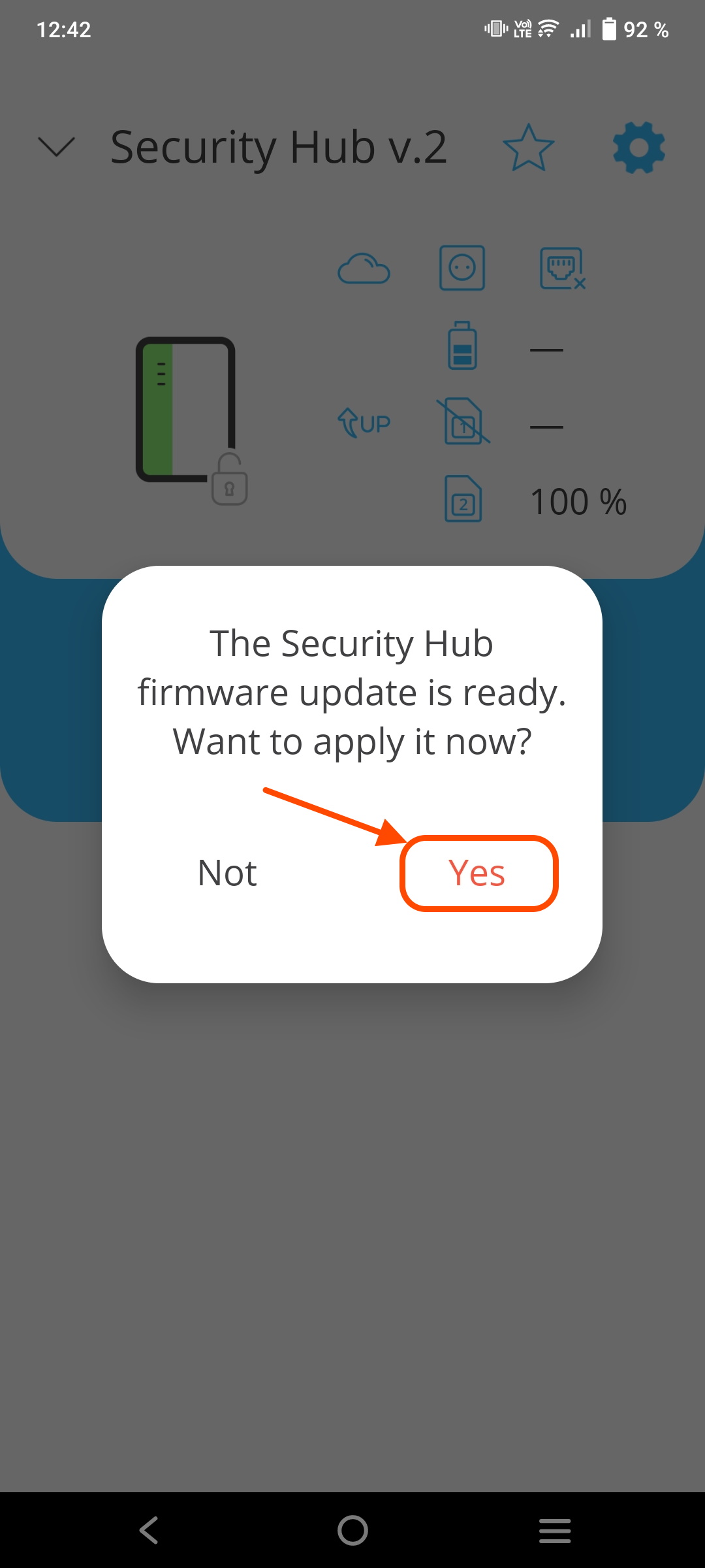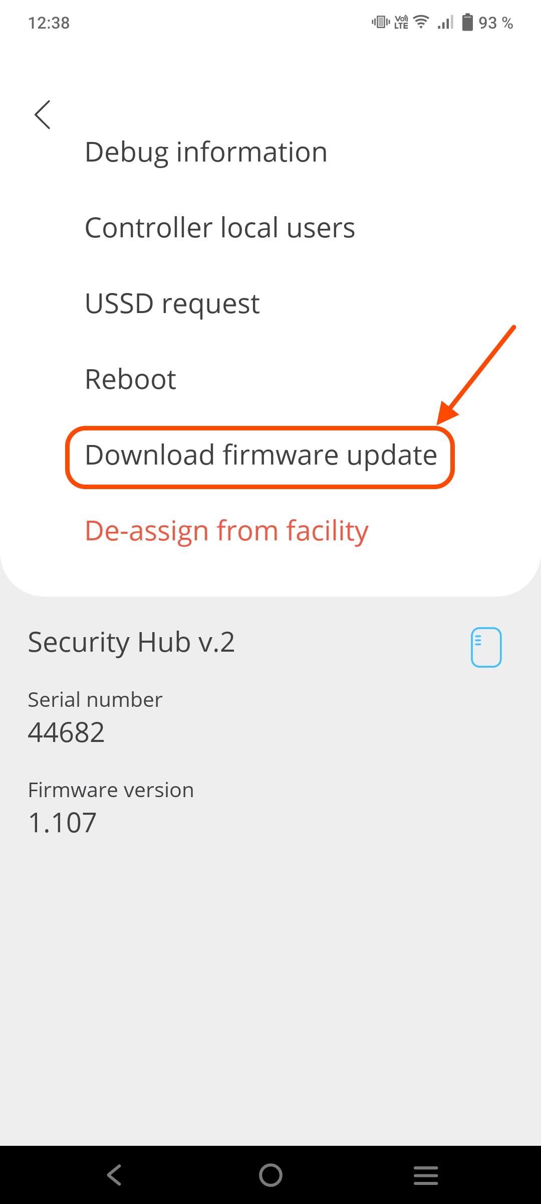 Update Security Hub controller to the latest FW version using mobile app To update the Security Hub controller follow the steps: Go to 'Devices' menu Select controller Click 'Settings' icon fig. 1 fig. 2 fig. 3 Click 'Download firmware update' Click 'Yes' Wait for 'Update icon' to appear fig. 4 fig. 5 fig. 6 Click 'Yes' fig. 7