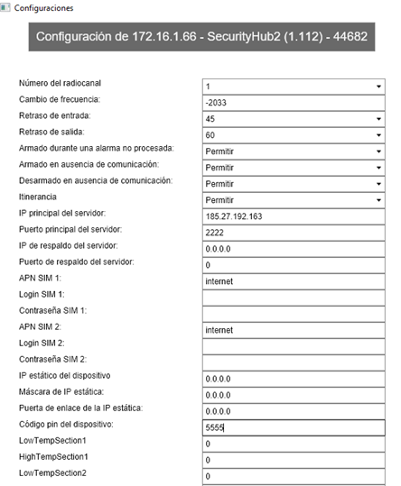 Código pin del dispositivo: código para acceder a la configuración interna del Security Hub a través de LocalConfig. El valor predeterminado es 5555.