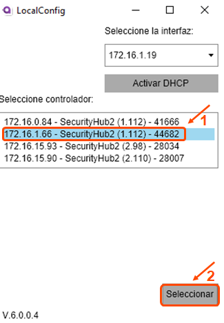 4. Seleccione el controlador y presione “Seleccionar”. El programa muestra la dirección IP del controlador y su número de serie