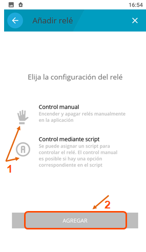 En el proceso de registro, debe elegir cómo se utilizará el relé (ver Fig. 7). Si se requiere una activación desde la aplicación móvil (Trigger), se selecciona "Control manual". Si necesita una automatización con escenarios más compleja, seleccione "Control mediante script".