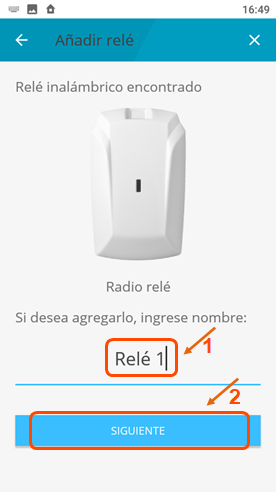 Ingrese un nombre para el relé y presione “Siguiente” |