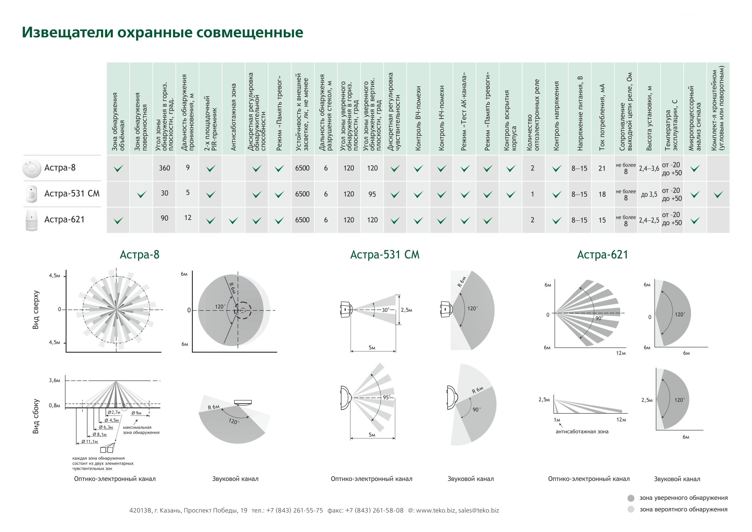Сравнительная таблица совмещенных извещателей: Астра-8, Астра-531 СМ, Астра-621
