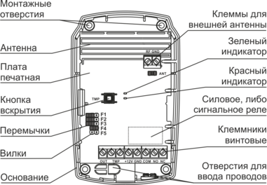 Встроенный радиомодуль диапазона 433 МГц РПУ имеет антенну, разведенную на печатной плате и возможность подключения внешней антенны с помощью клеммных колодок RF - GND. При подключении внешней антенны перемычку с вилки ANT необходимо удалить.