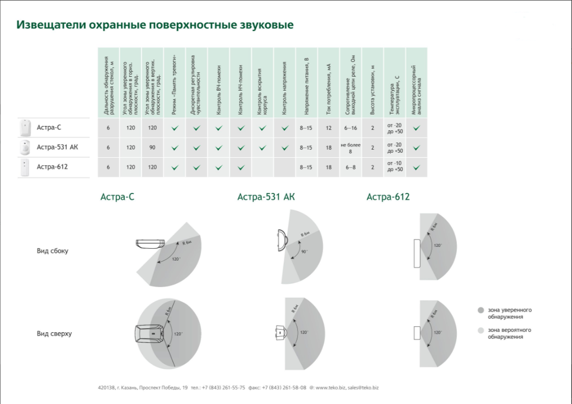 Сравнительная таблица извещателей звуковых: Астра-С, Астра-531 АК, Астра-621