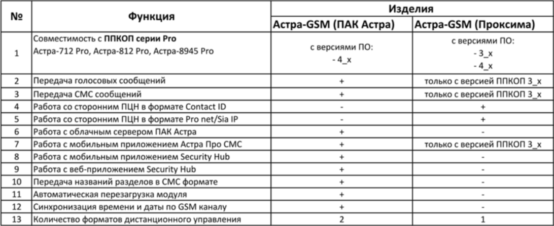 Сравнительная таблица модулей коммуникации:Астра-GSM (ПАК Астра) и Астра-GSM (Проксима) совместимости с ППКОП версиями ПО v3_х - 4_х