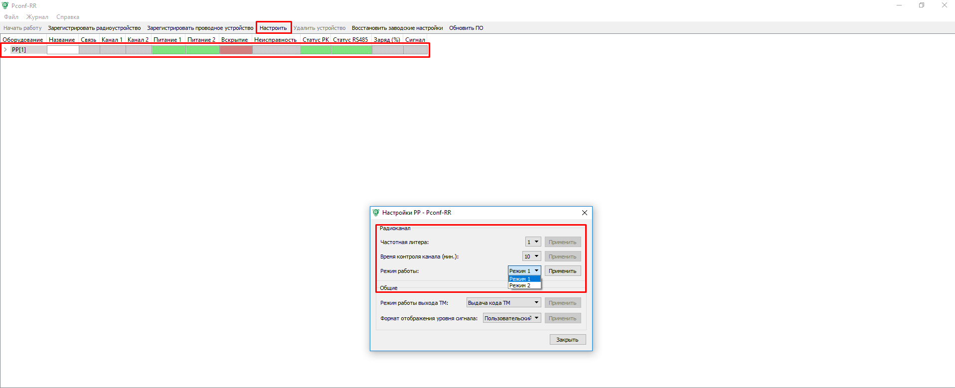 - в вспомогательном окне "Настройки РР - Pconf-RR", изменить "Режим работы" (Режим 1 или 2) - Применить; "Частотная литера" (1 или 3) - Применить.