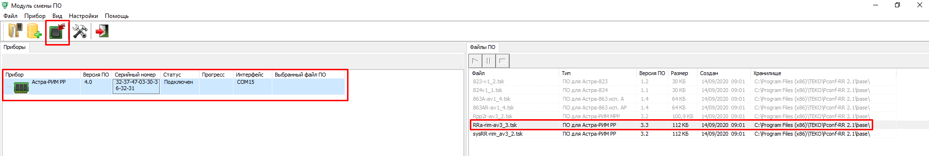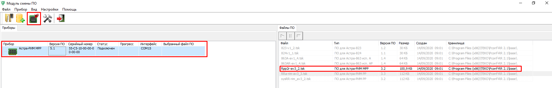 - выбрать версию ПО Rpp2r-av3_2, нажать на значок "Запустить процесс записи файла ПО в прибор".