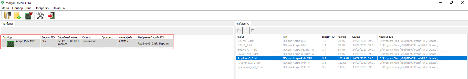 - в левом окне выделить радиомодуль Астра-РИМ МРР версия ПО 5.х;