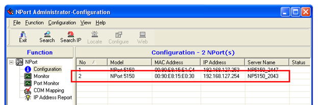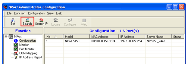 Запустите утилиту NPort Administrator. Нажмите кнопку “Search” на панели инструментов, утилита найдет подключенное устройство NPort No1: