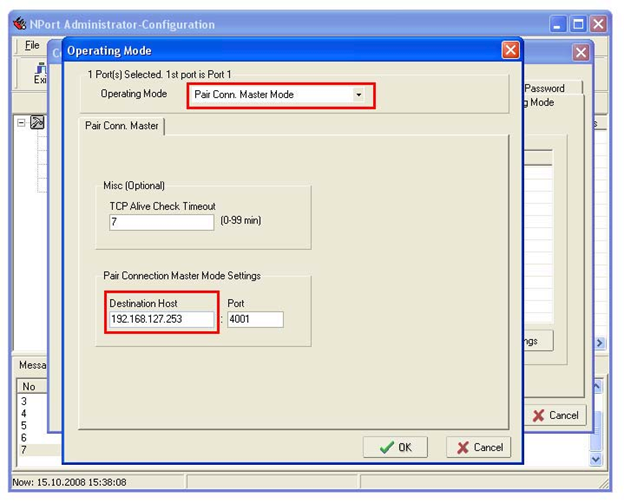 Откройте вкладку Operating Mode. Поставьте галочку Modify и кликните два раза на строку в списке, чтобы открыть окно изменения режима работы и задать режим работы Pair Connection Master, заданный для устройства NPort №2.