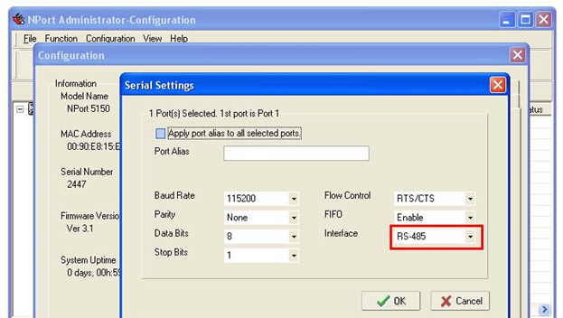 Сохраните созданную конфигурацию NPort, нажав кнопку OK в окне «Configuration».