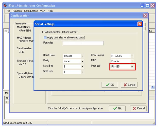 Настройка параметров последовательного интерфейса устройства NPort №1