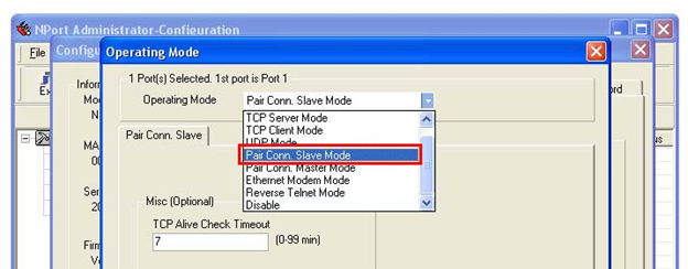 Режим работы устройства NPort устанавливается во вкладке Operating Mode. Поставьте галочку Modify и кликните два раза на строку в списке, чтобы открыть окно изменения режима работы и задать режим работы Pair Connection Slave, назначенный устройству NPort №1: