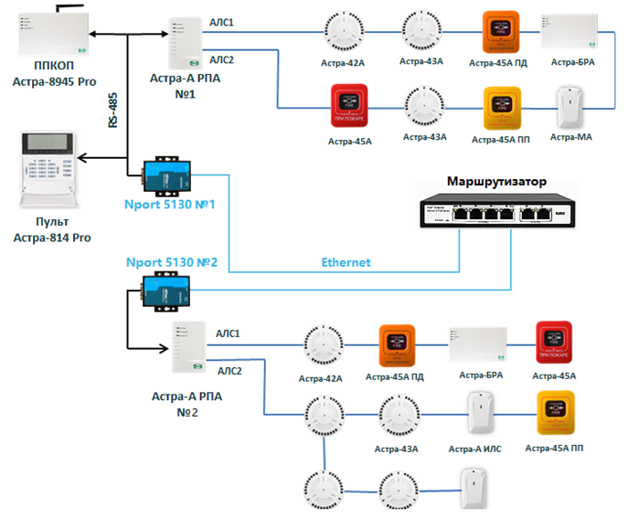 Прокладка интерфейса RS-485 системы Астра не всегда бывает возможной. Иногда требуется передавать данные по уже проложенным локальным сетям Ethernet или даже по Интернету. Для этого нам потребуются преобразователи интерфейса RS-485/Ethernet, например, преобразователь NPort 5150 (или 5130) производства фирмы Moxa.