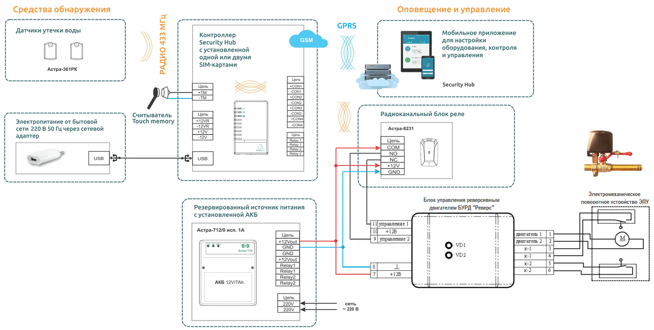 Данная схема будет работать с шаровыми кранами со встроенным электроприводом и отдельными входами «Открыть» «Закрыть». Но бывают случаи, когда необходимо установить электромеханический привод, управляемый реверсивным питанием. В этом случае понадобится дополнительный блок управления реверсивным двигателем (например, БУРД Реверс производства НПП Магнито-контакт) или блок с двумя реле (например, УК-ВК/02).