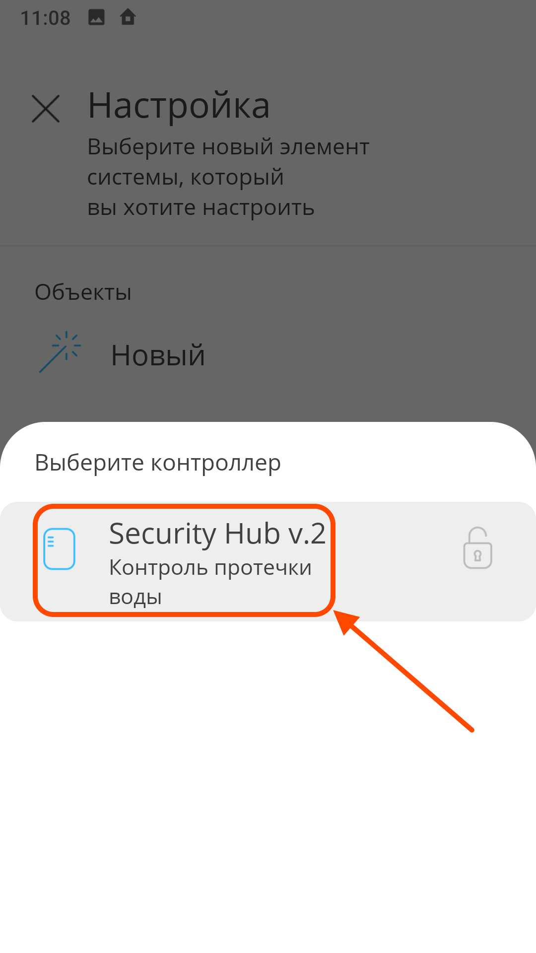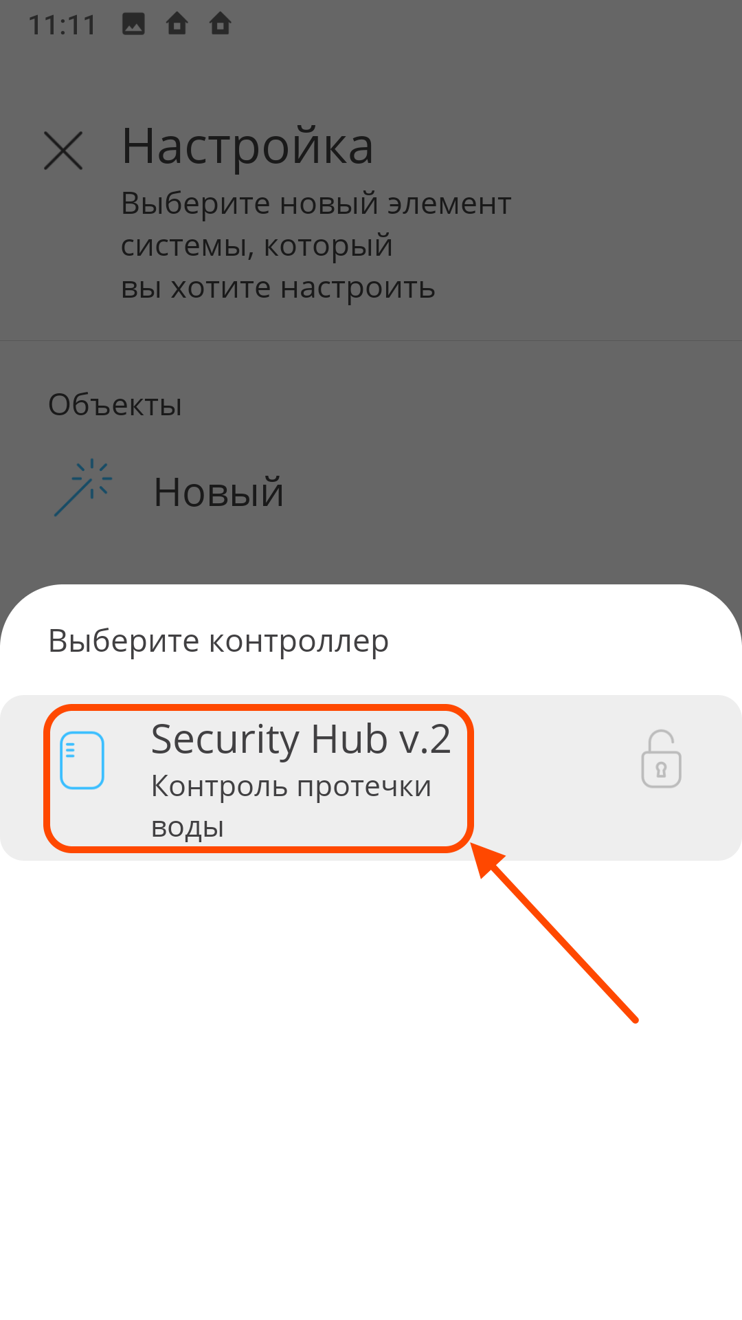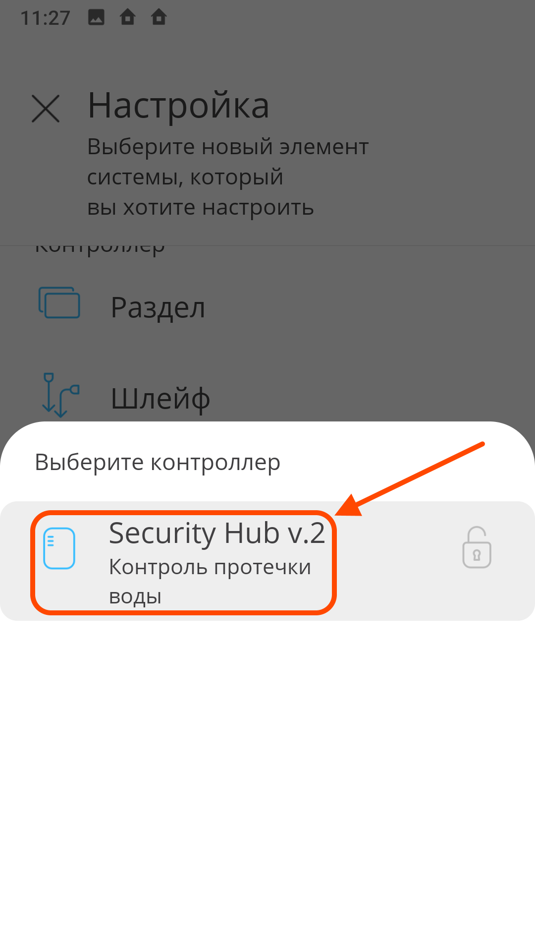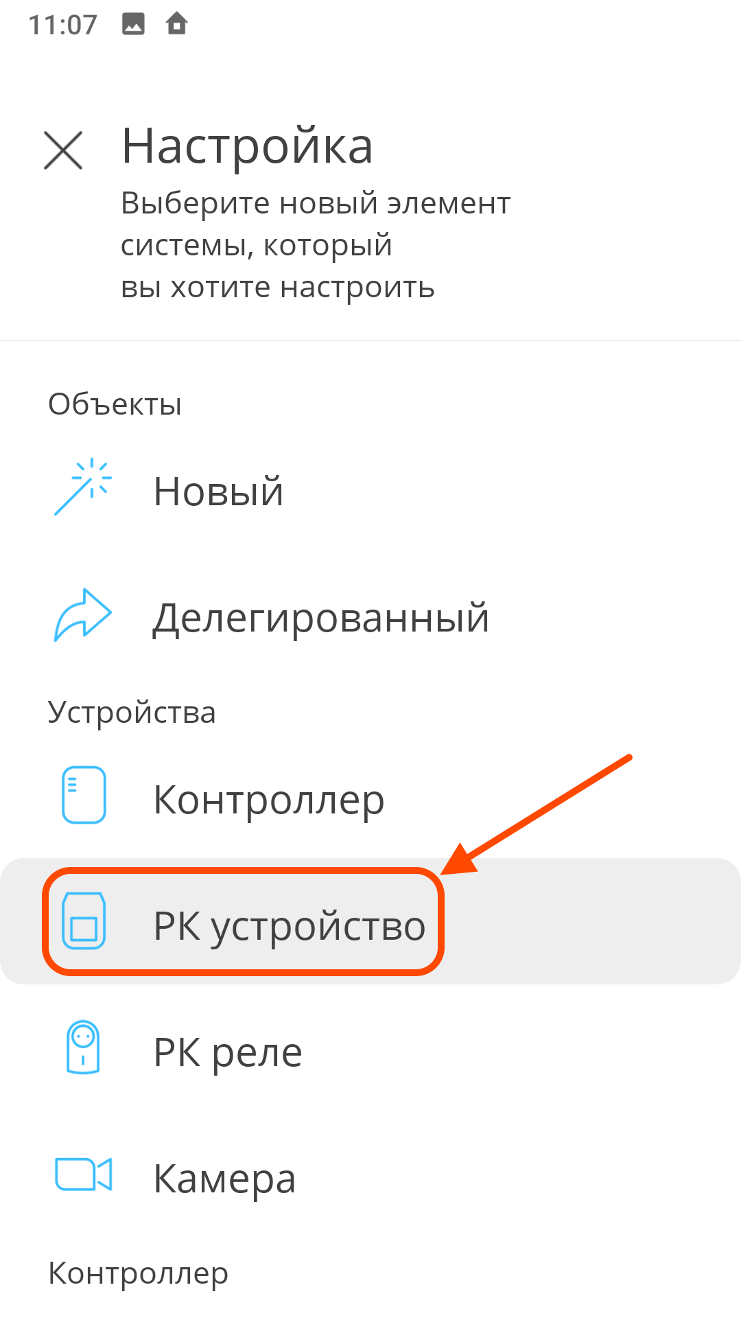 | На главном экране Нажмите "+" в верхнем левом углу экрана | В меню "Настройка" выберите элемент "РК устройство" | Выберите программируемый контроллер Security Hub |