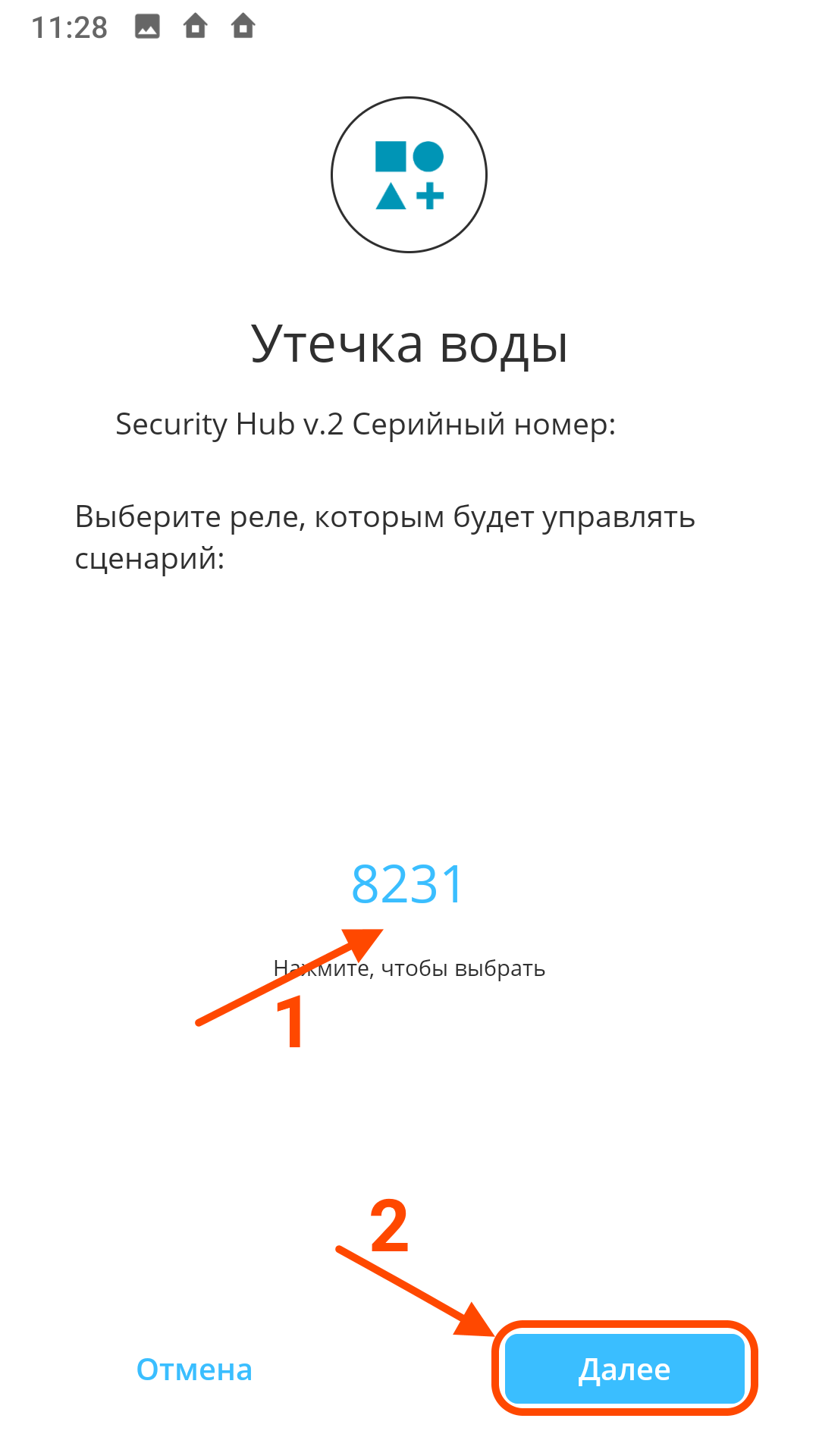 | Выберите сценарий "Утечка воды" | Изучите режим работы | Выберите созданное ранее реле |