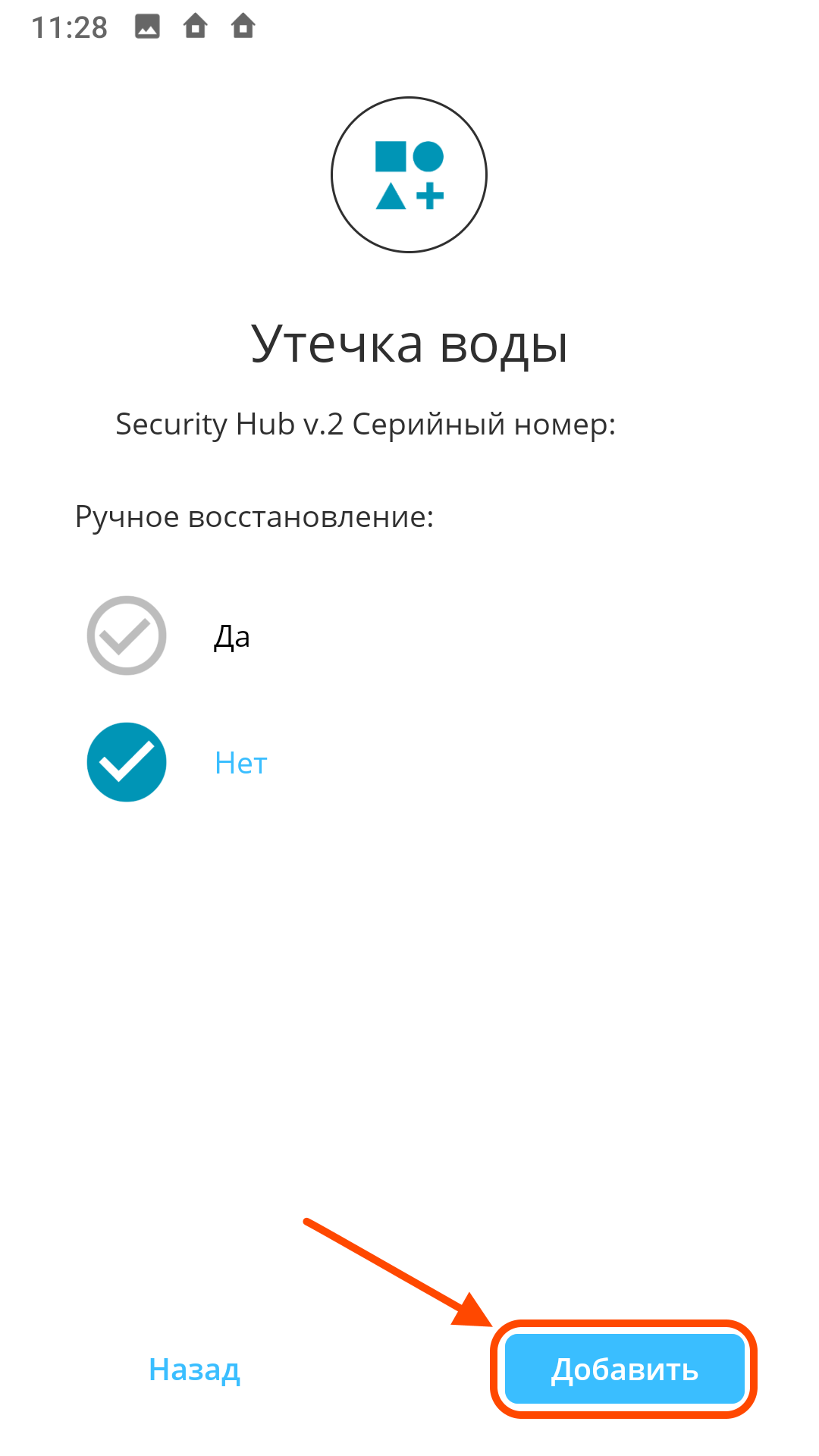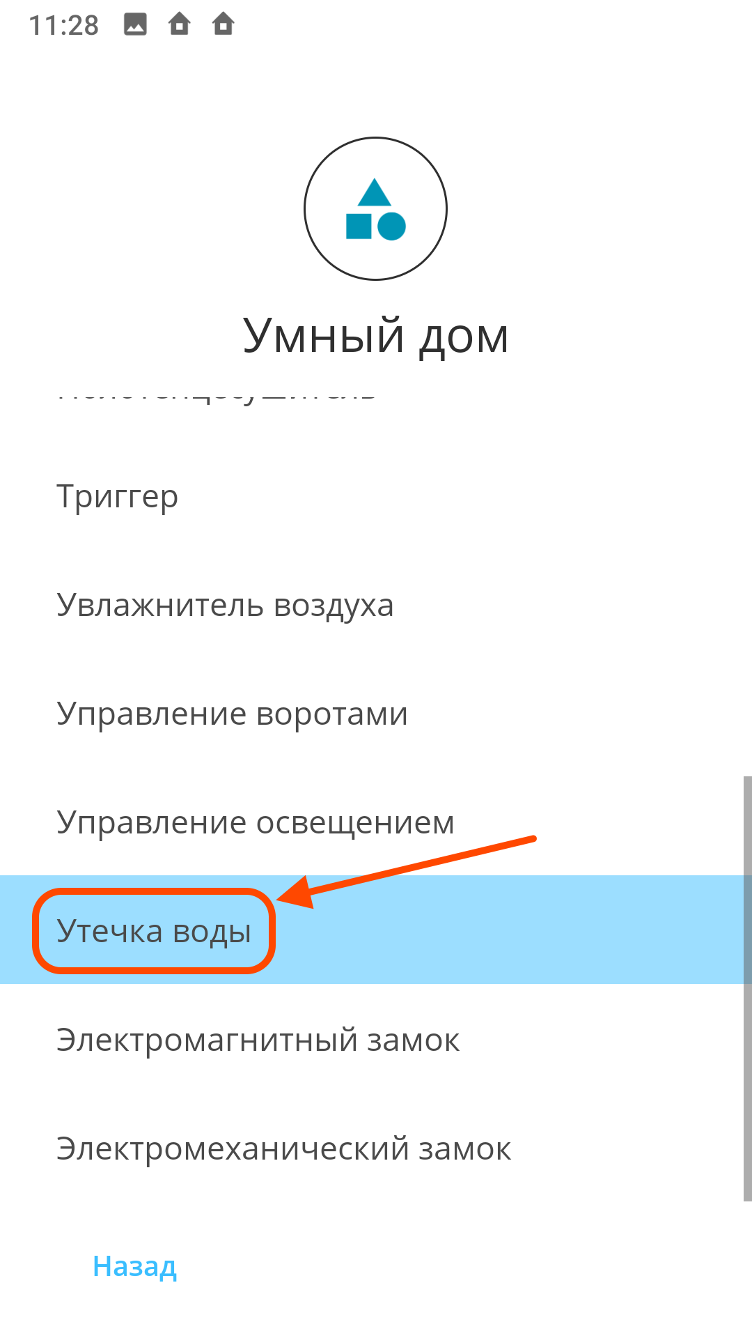 3 этап. Добавление и настройка сценария «Утечка воды» из категории «Умный дом».