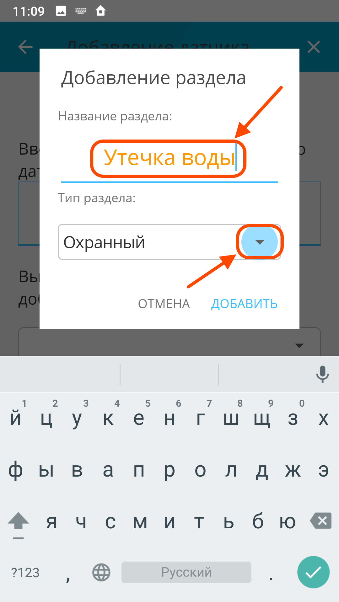 | Придумайте название датчика и добавьте его в раздел | Если созданных разделов нет, то добавьте новый | Придумайте название разделу и выберите тип "Технологический" |