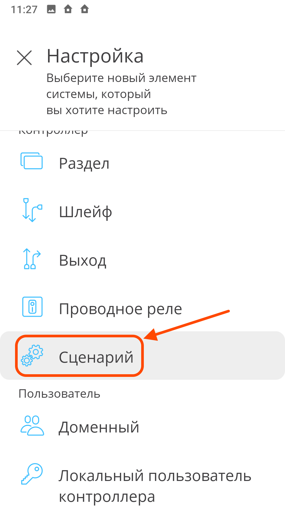 | В меню "Настройка" выберите элемент "Сценарий" | Выберите программируемый контроллер Security Hub | Выберите категорию "Умный дом" |