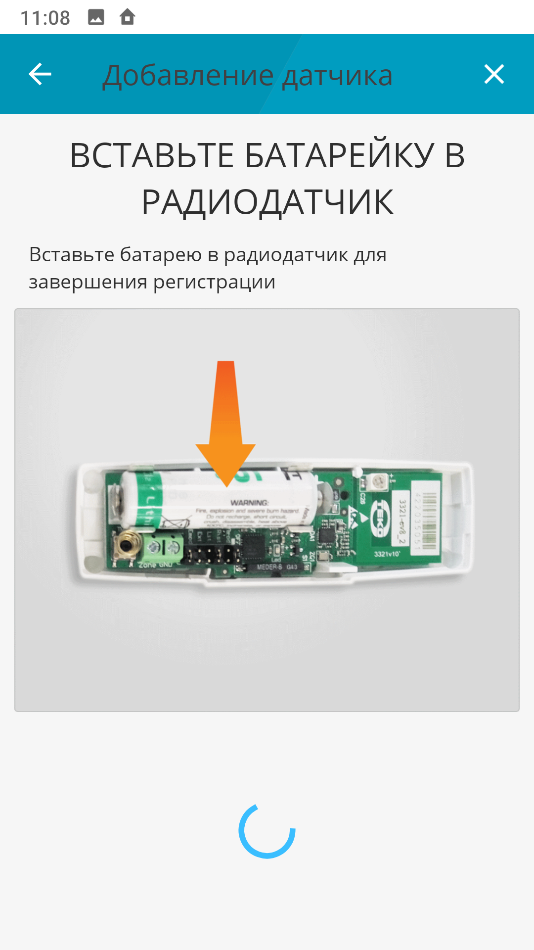 | Включите режим регистрации | Вставьте элемент питания в датчик "Астра-361 РК" | При успешном обнаружении нажмите "Продолжить" |