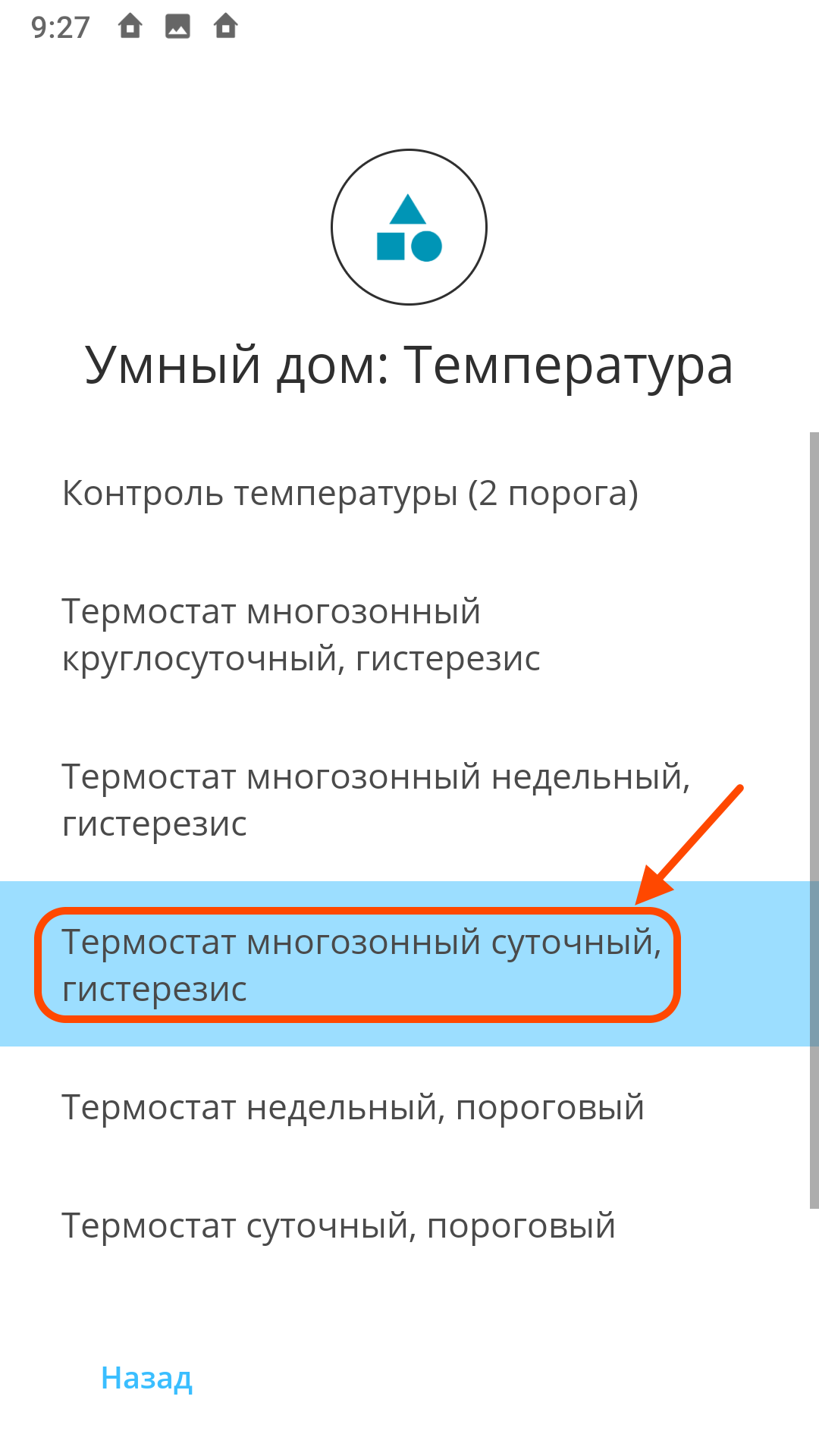 Для примера выбран сценарий «Термостат многозонный недельный, гистерезис».