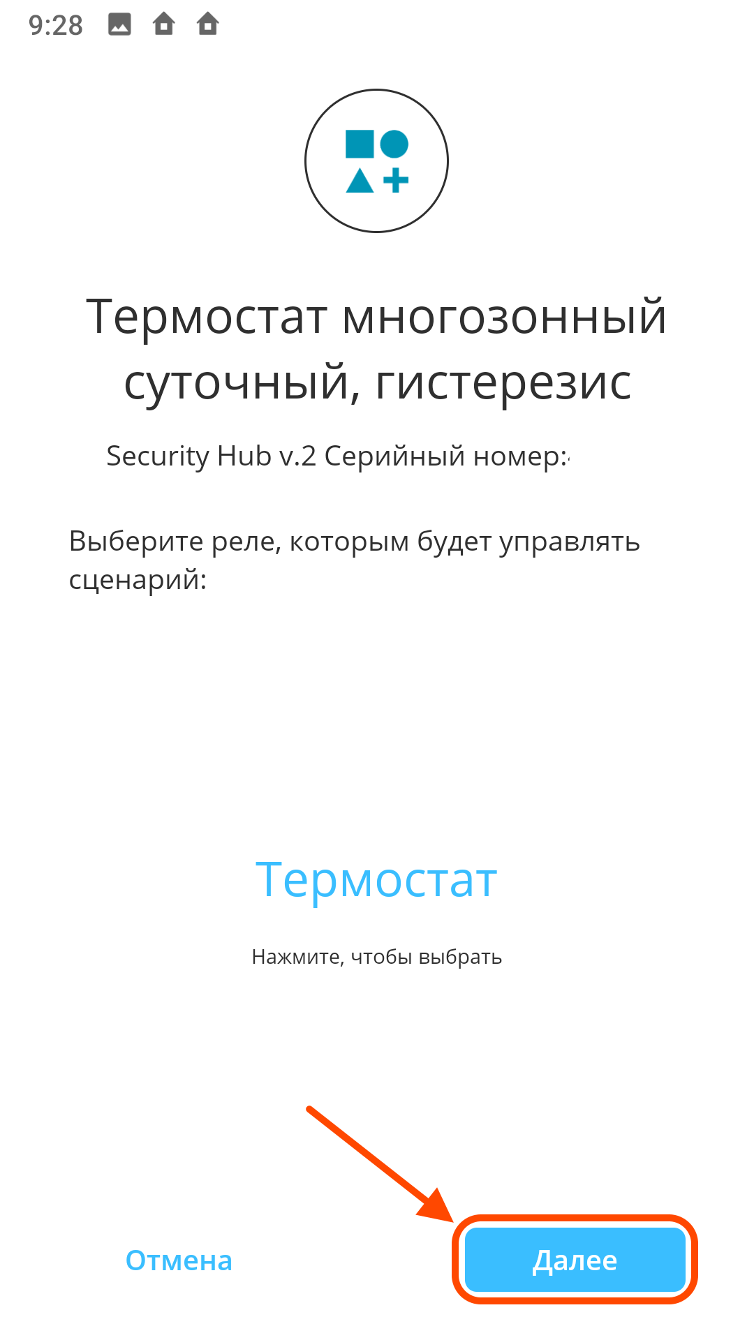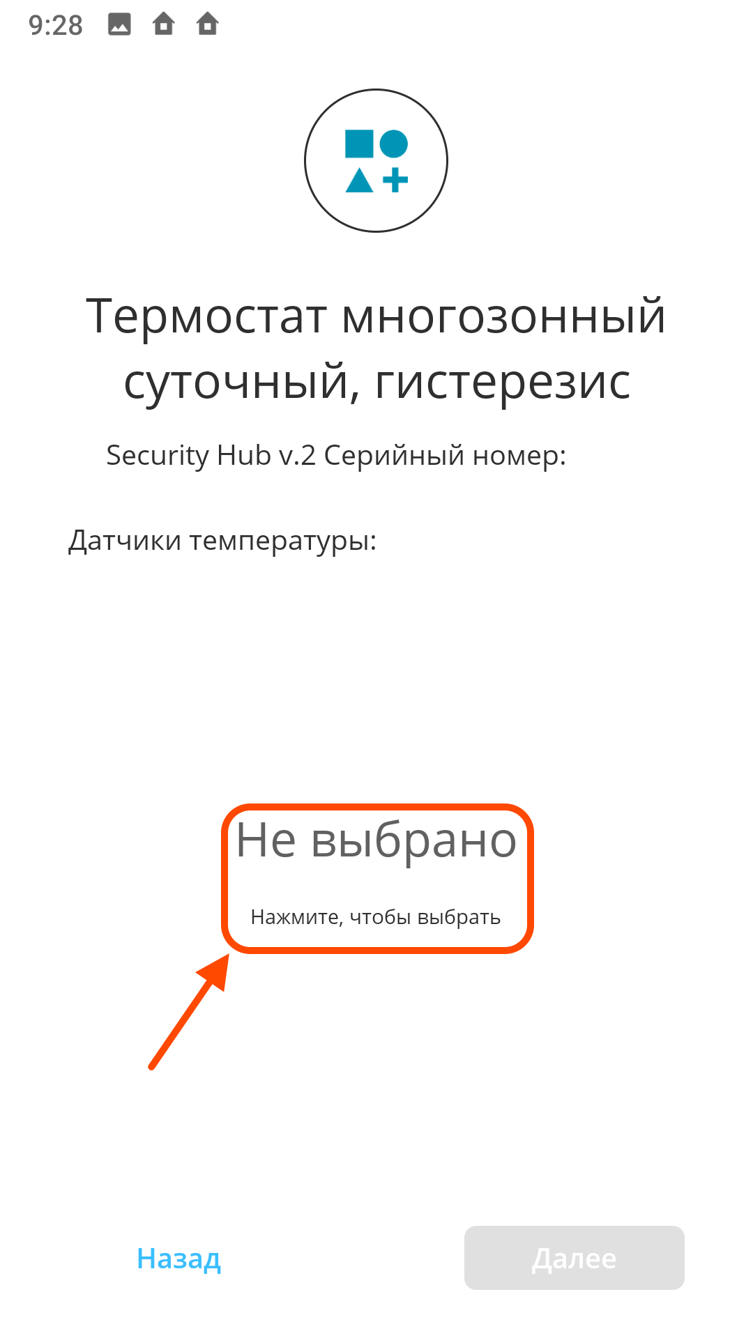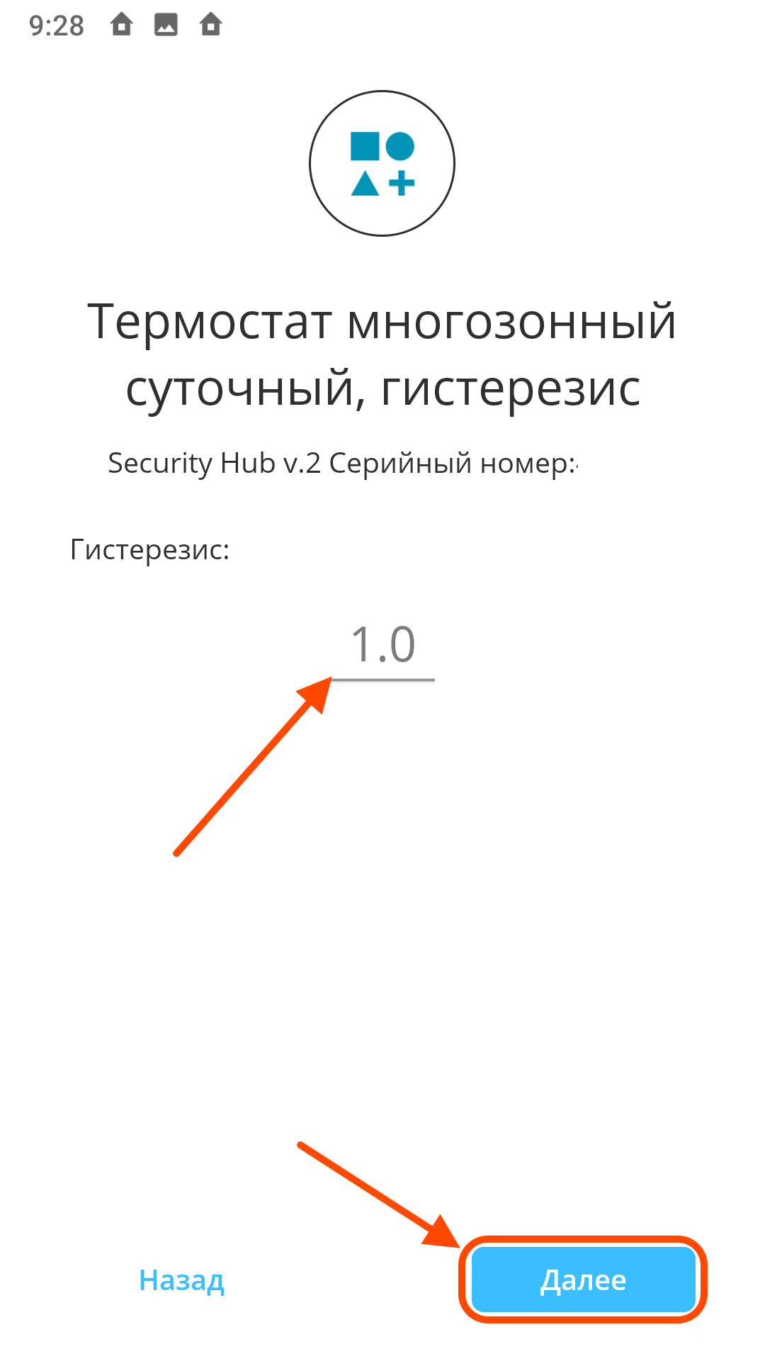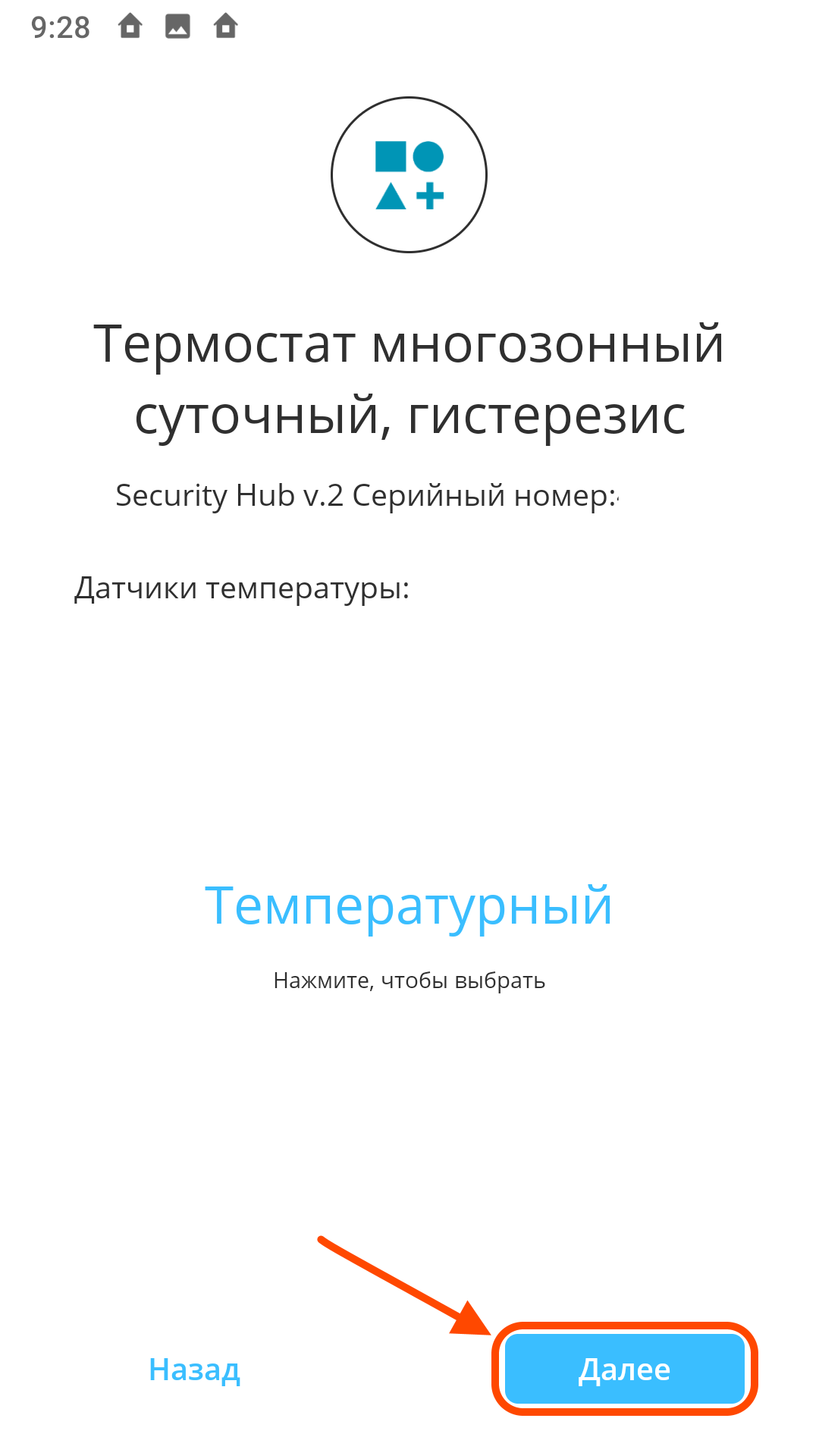 | Выберите датчики температуры, задействованные в сценарии | Нажмите кнопку "Далее" | Установите гистерезис (для 1 датчика выставляется значение не менее "1") |