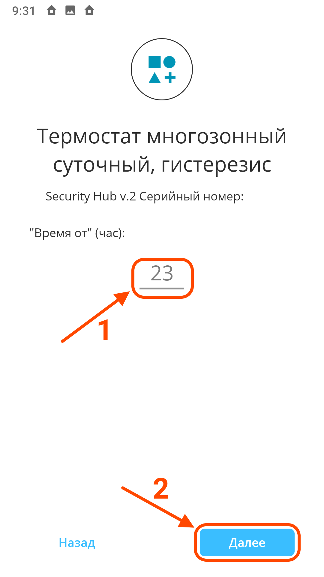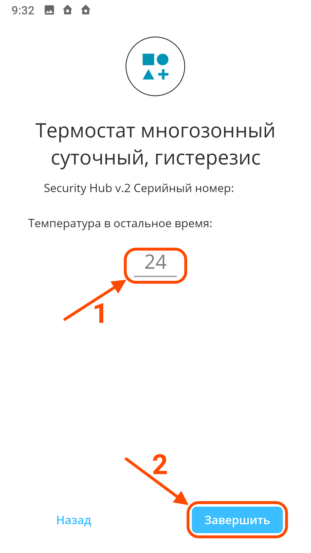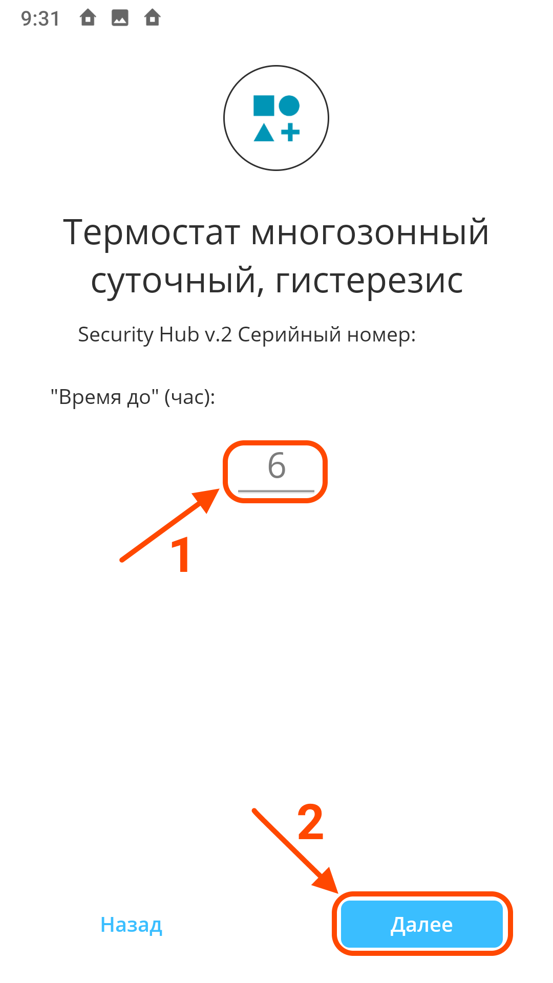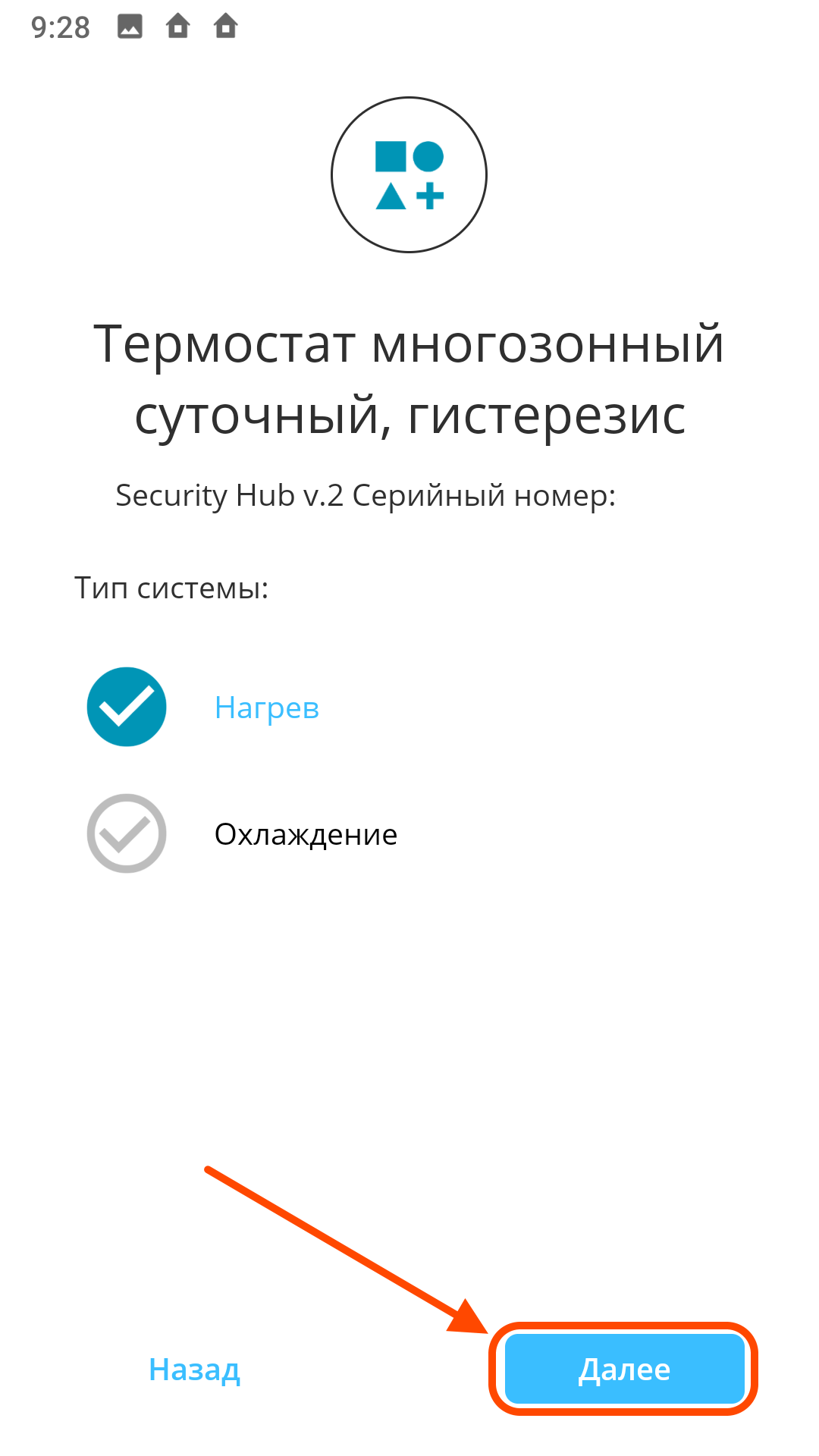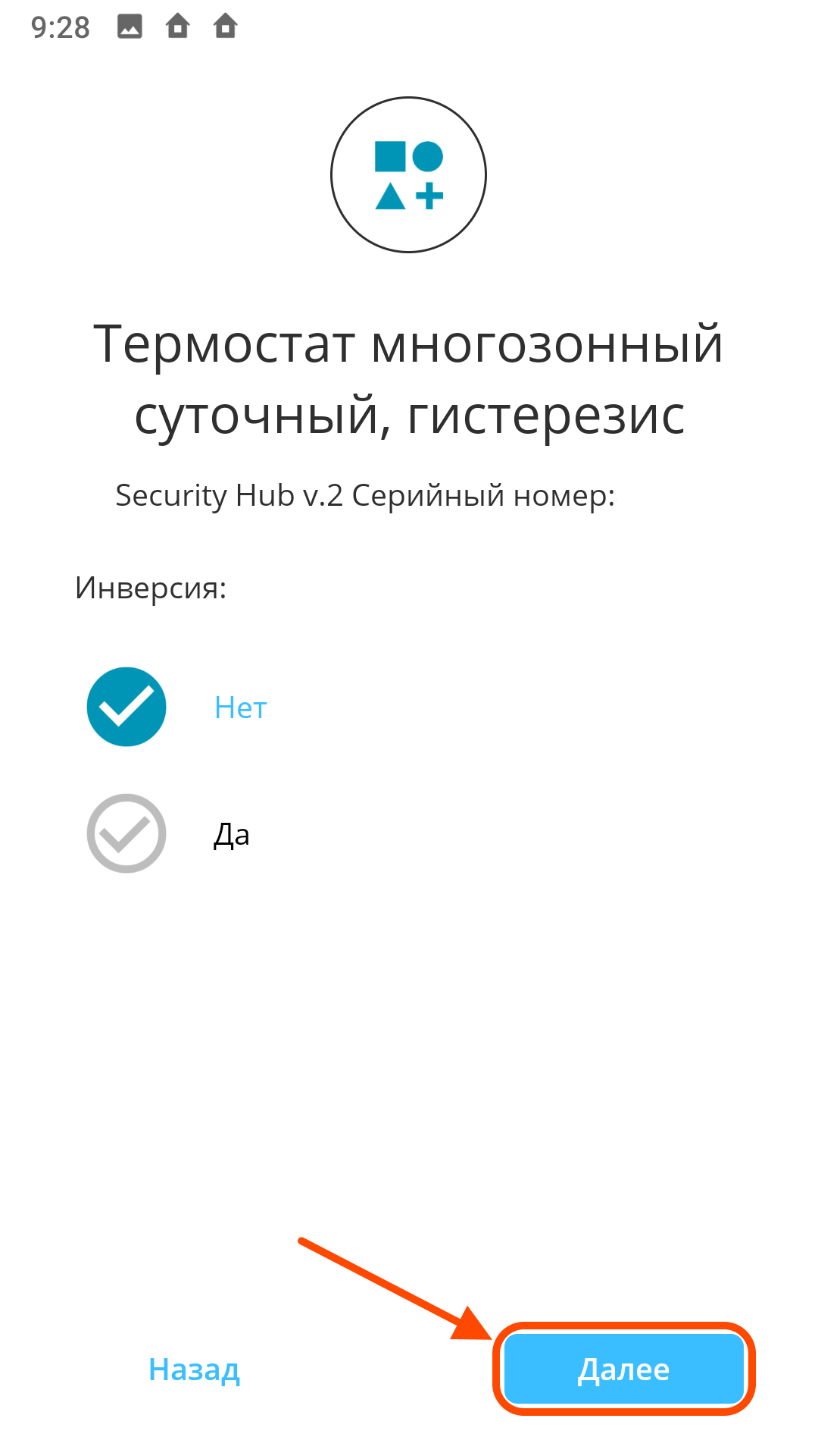 | Выберите датчики температуры, задействованные в сценарии | Нажмите кнопку "Далее" | Установите гистерезис (для 1 датчика выставляется значение не менее "1") |