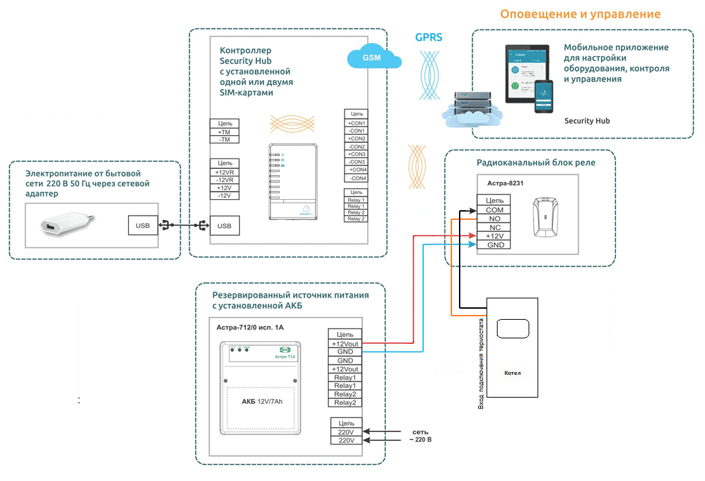 При помощи Security Hub можно управлять практическим любым котлом отопления, имеющим возможность подключения внешнего термостата.