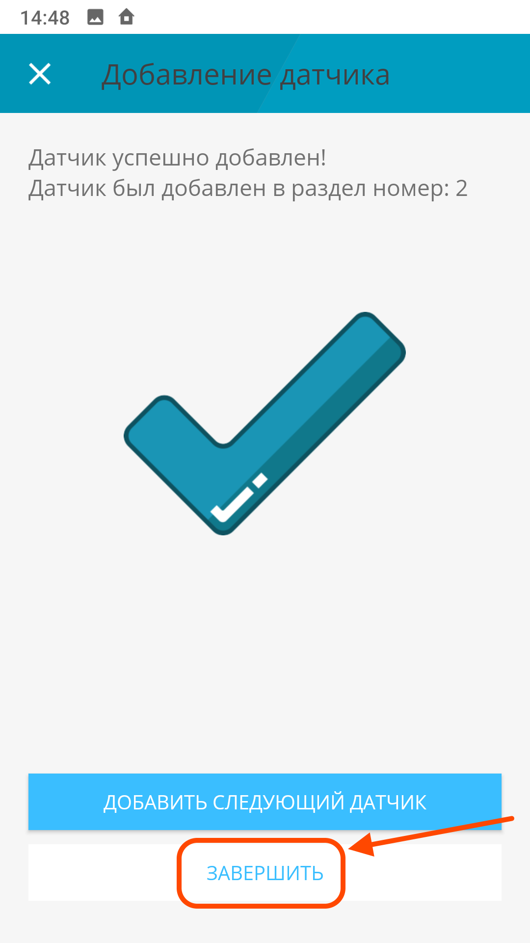 | Если раздел ещё не существует, то создайте его | Нажмите кнопку "Зарегистрировать" | Завершите добавление датчика кнопкой "Завершить" |