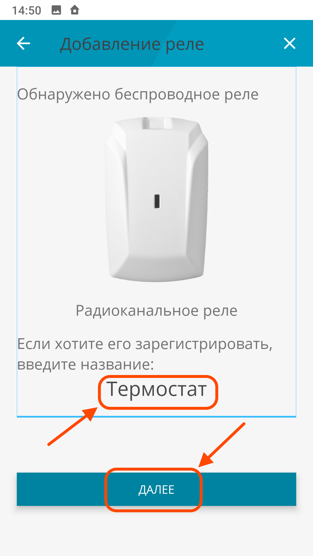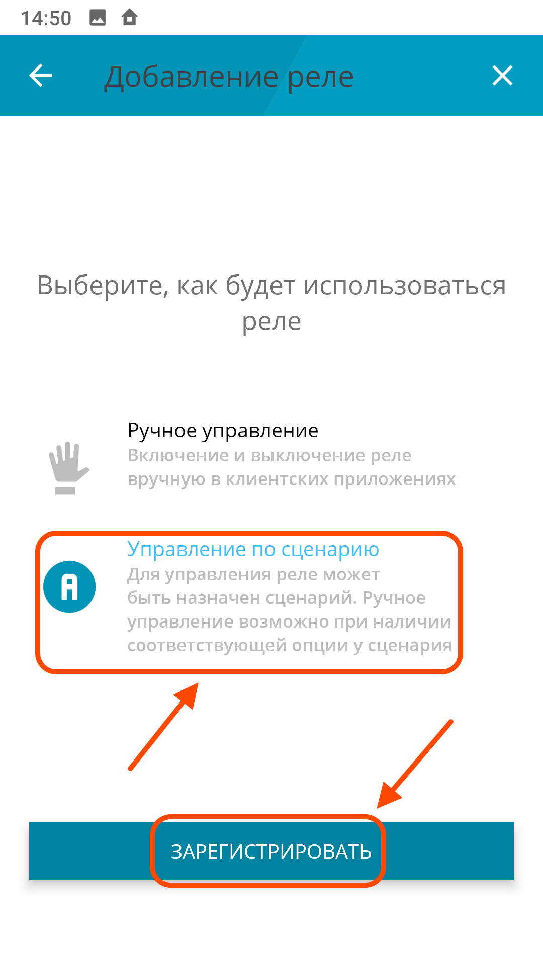 | Придумайте название для радиореле и нажмите "Далее" | Выберите "Управление по сценарию" и нажмите "Зарегистрировать" | Завершите добавление реле кнопкой "Завершить" |