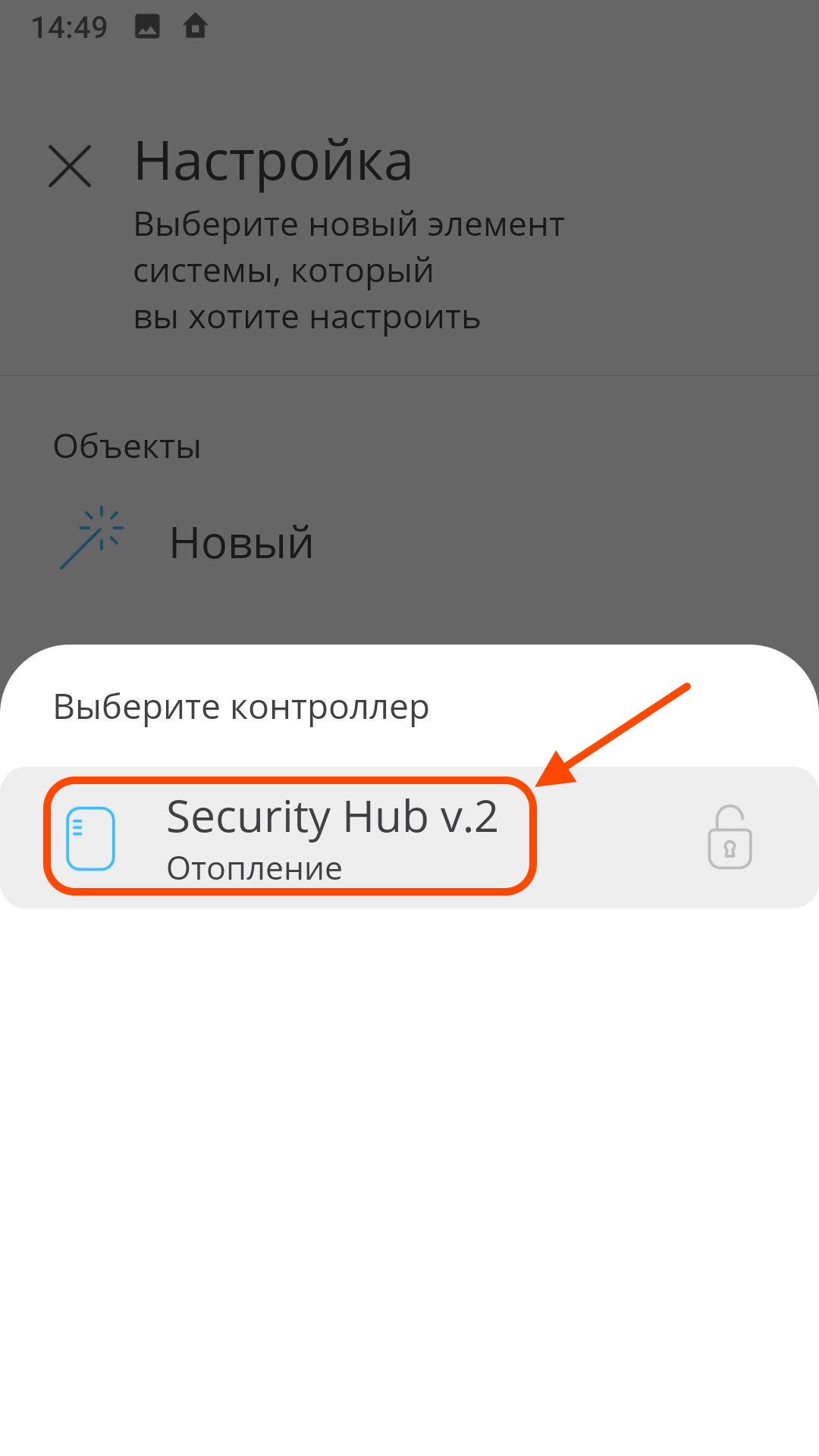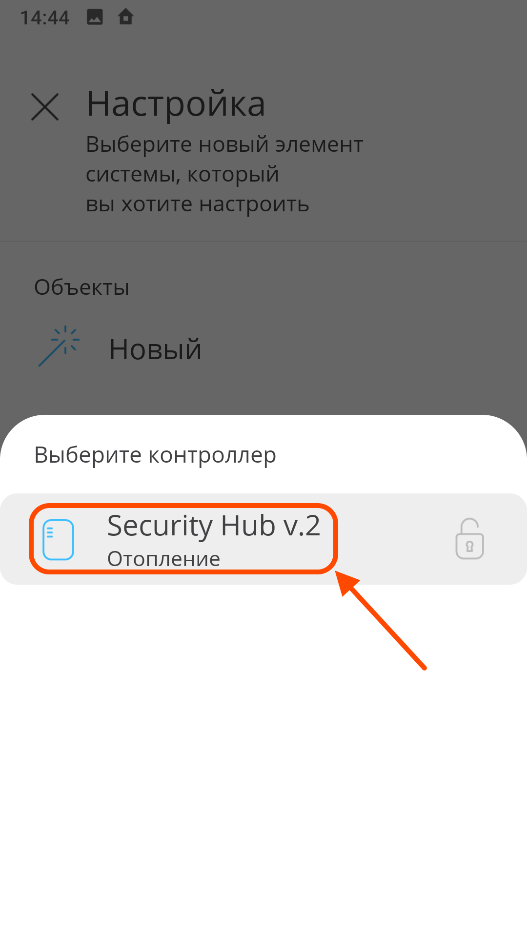 | На главном экране Нажмите "+" в верхнем левом углу экрана | В меню "Настройка" выберите элемент "РК устройство" | Выберите программируемый контроллер Security Hub |