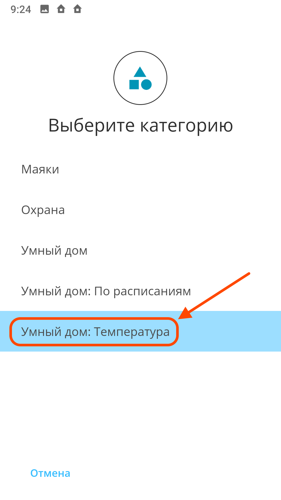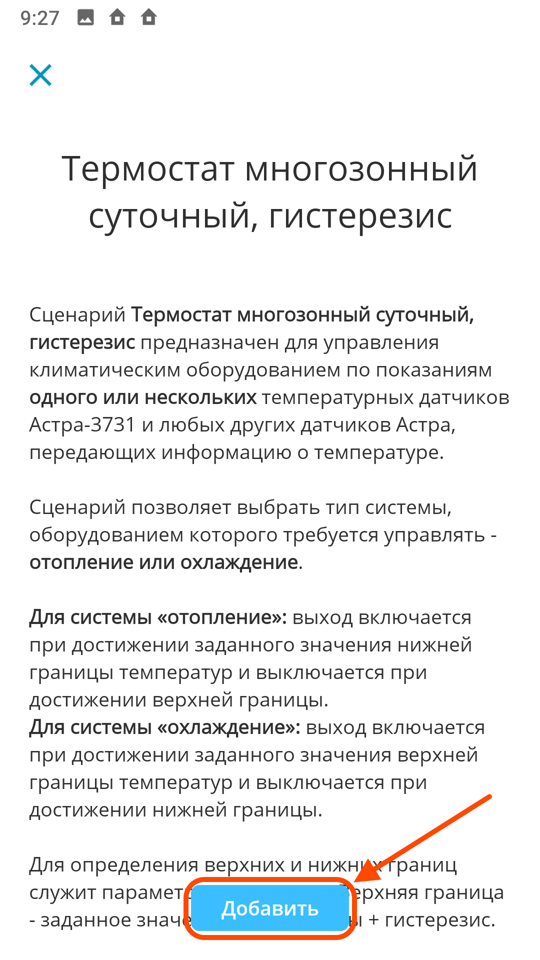 | Зайдите в созданное реле и нажмите "Добавить" сценарий | Выберите категорию "Умный дом: Температура" | Выберите сценарий "Термостат многозонный суточный, гистерезис" |