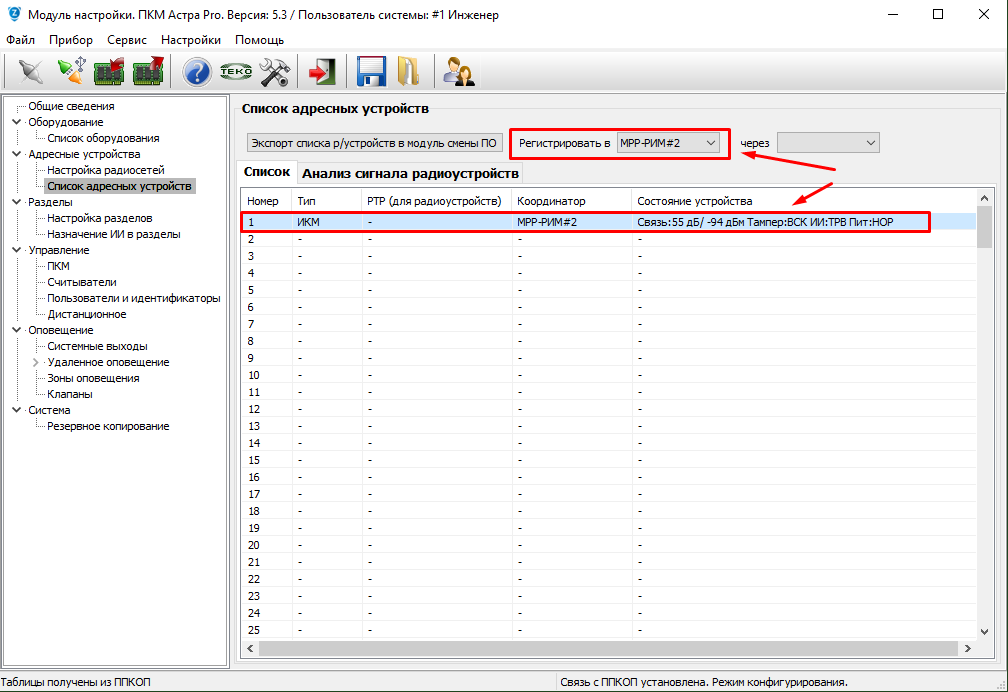 В меню «Адресные устройства» - «Список адресных устройств», выбрать регистрировать в «МРР-РИМ#2»