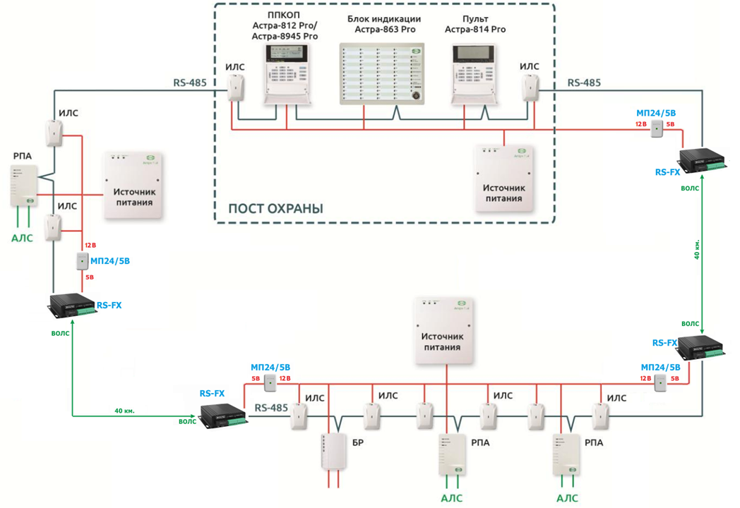 Входное напряжения питания для преобразователей серии RS-FX - 5В, поэтому для организации резервированного питания волоконно-оптических преобразователей от источника питания Астра 712/0 12В необходимо использовать преобразователи напряжения из 12В в 5В для этого в данном примере используется модуль МП 24/5 В.