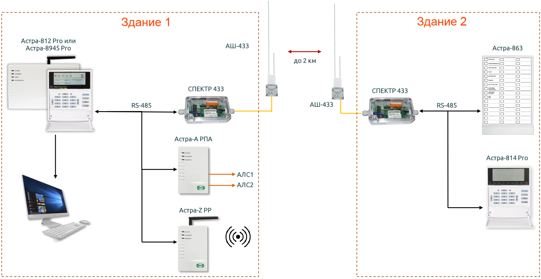 Есть решение по созданию радиоканальной связи между отдаленным объектом с помощью радиомодема. Для это используются два преобразователя «СПЕКТР 433» компании РАТЕОС: один – на ППКОП, второй – на стороне удаленных приборов системы.