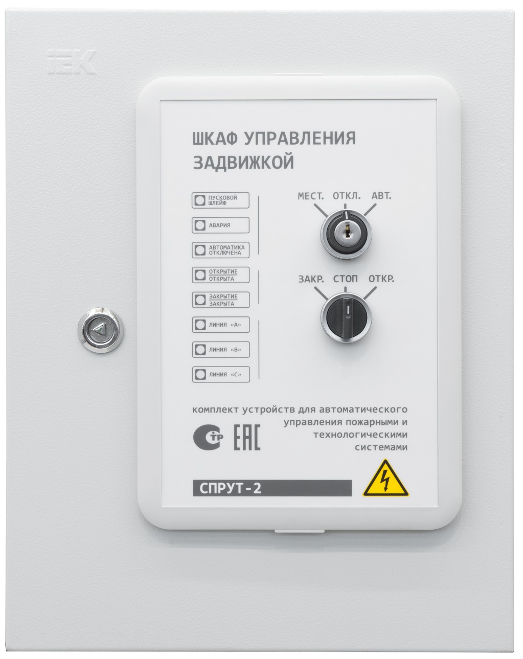 На лицевой панели ШУЗ расположены светодиоды индикации, «Переключатель режима работы» с ключом и «Переключатель управления задвижкой в местном режиме».