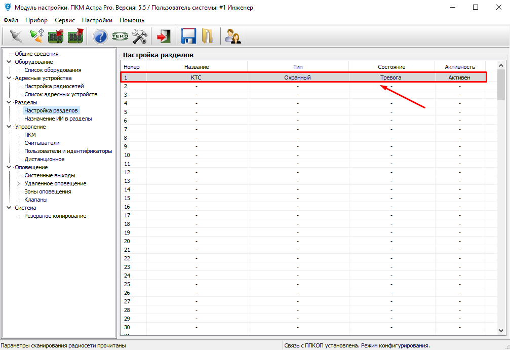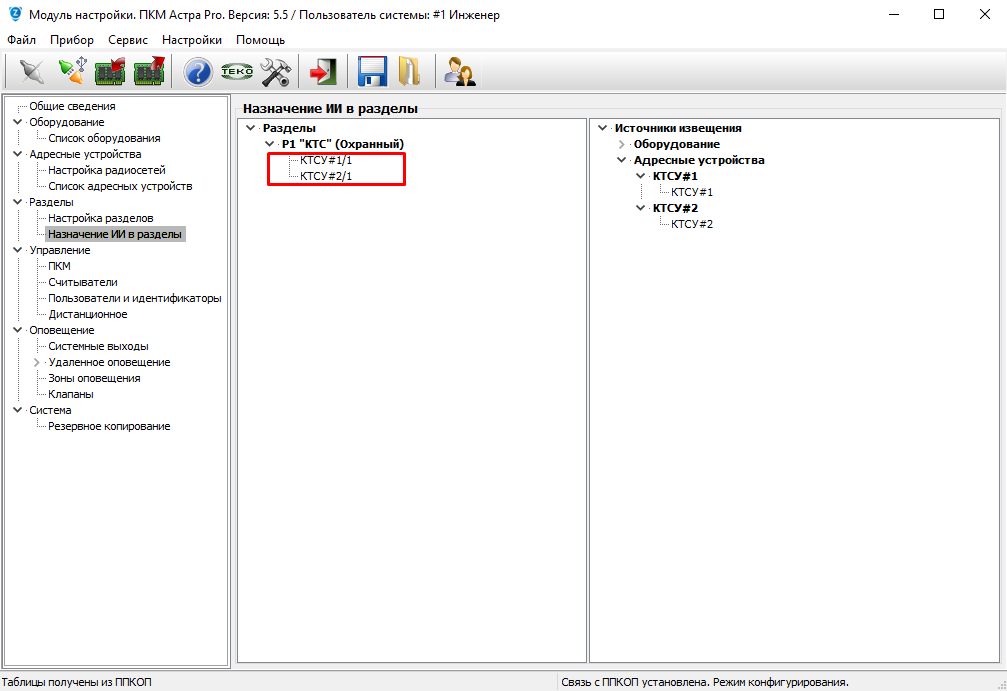 В меню "Назначение ИИ в разделы", закрепить КТСУ#1/1 и КТСУ#2/1 за созданным разделом