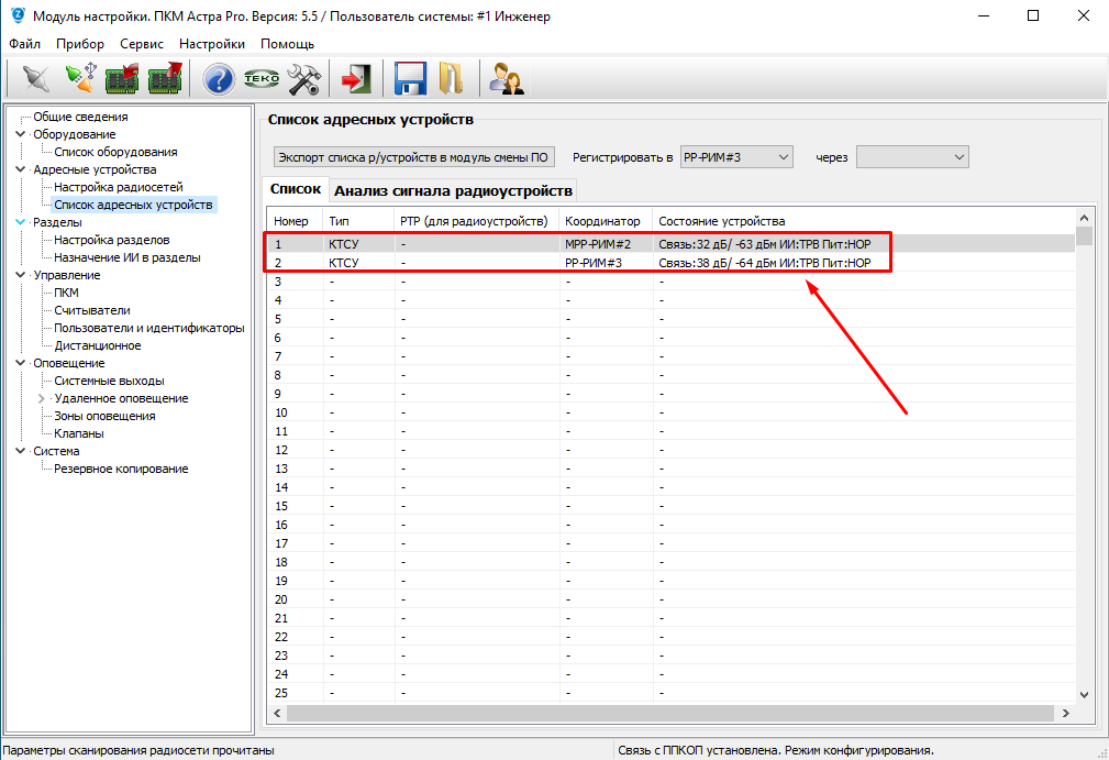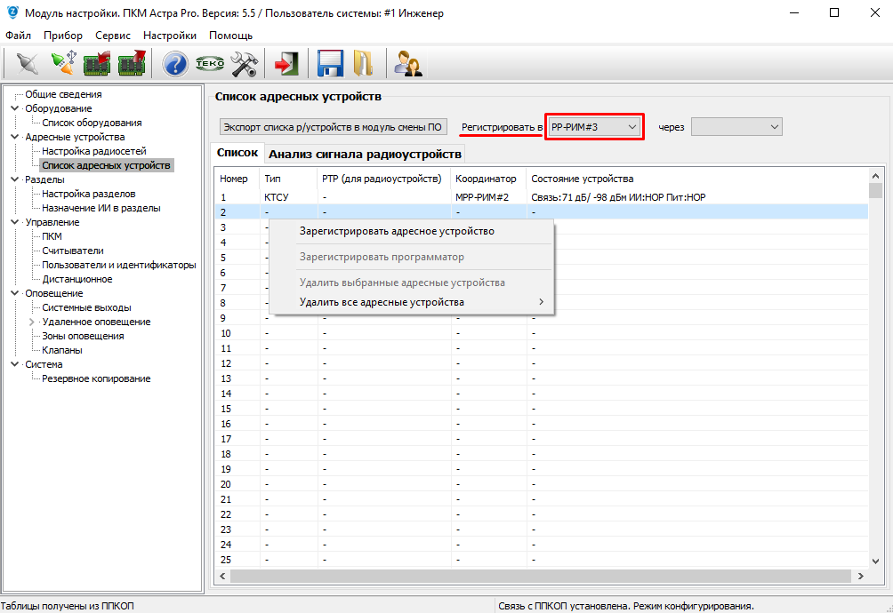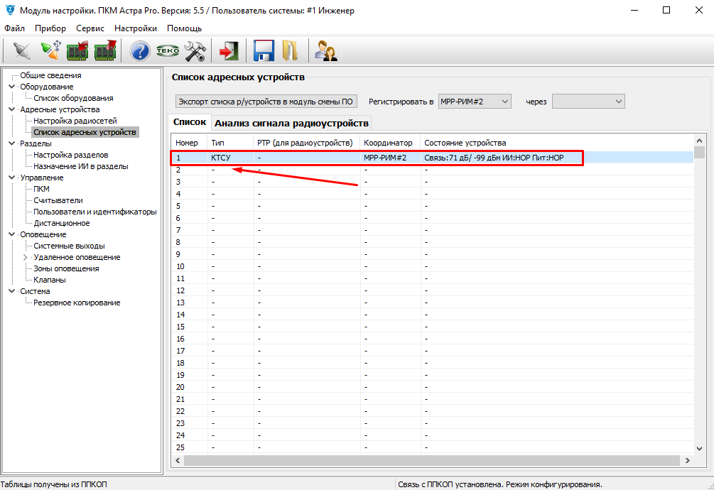 Запустить регистрацию на этом же радиоканальном устройстве Астра-РИ-М РПДК, при успешной регистрации, брелок КТСУ отобразится в "Списке адресных устройств", координатор РР-РИМ#3