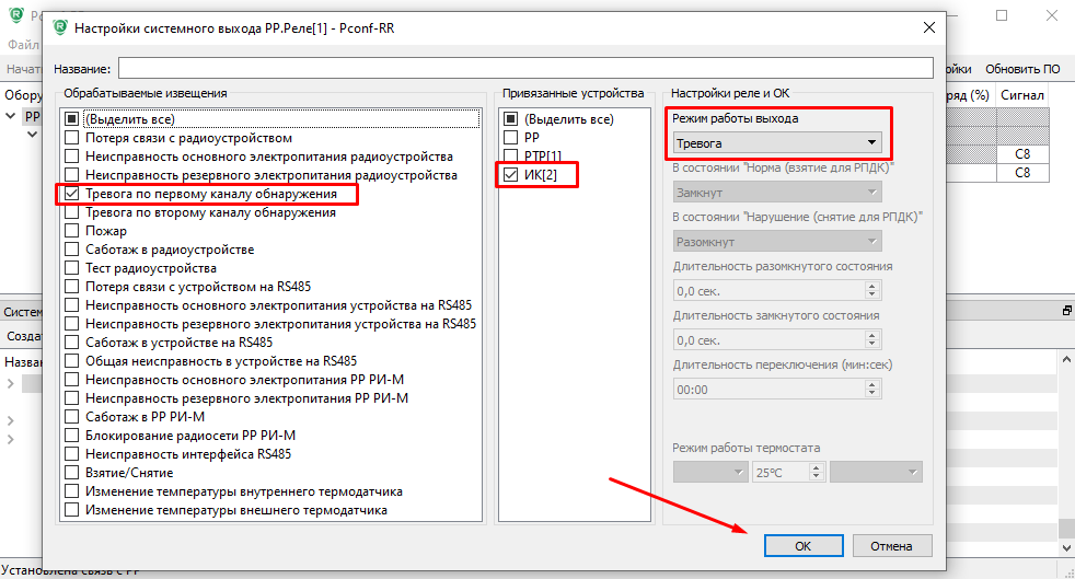 В меню "Системные выходы" выбрать необходимый выход - РР.Реле[1], нажать "Настроить"