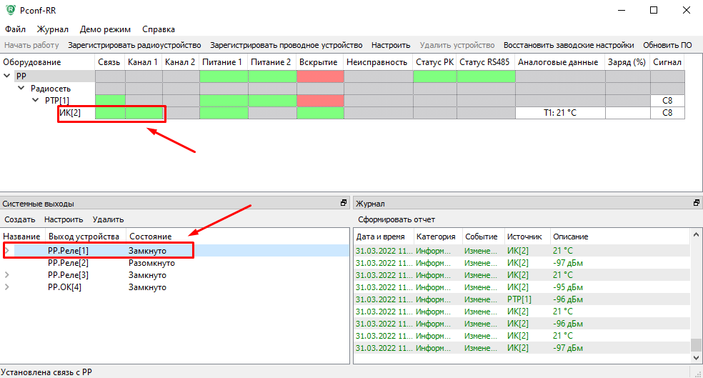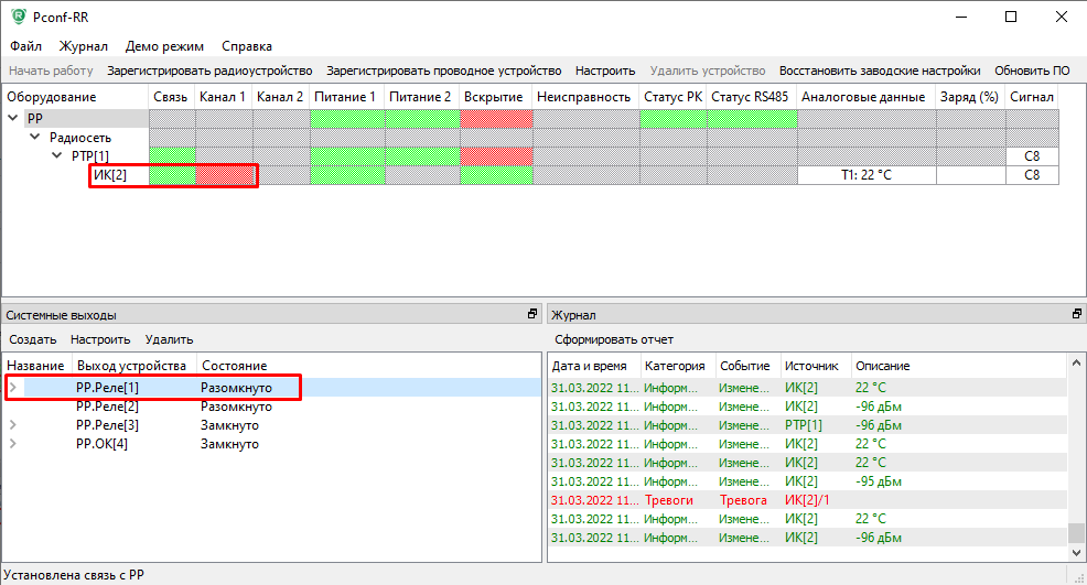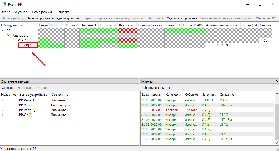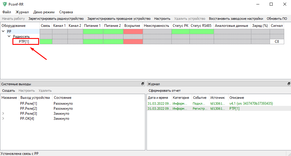 В случае успешной регистрации индикатор НАРУШЕНИЕ на РР замигает зеленым светом с частотой 8 раз/с, список устройств в основном окне интерфейса программы обновится и появится новое устройство - РТР