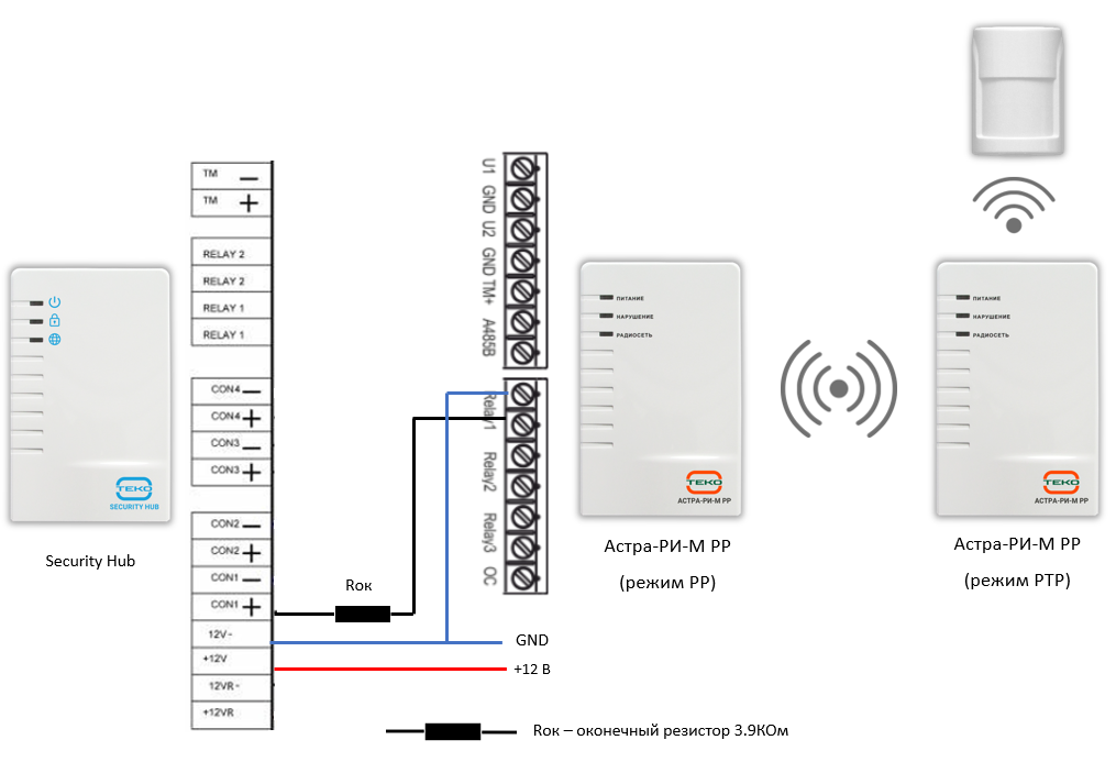 5. Подключение системного выхода Астра-РИ-М РР (режим РР) к входу контроллера "Security Hub" и настройка в МП.