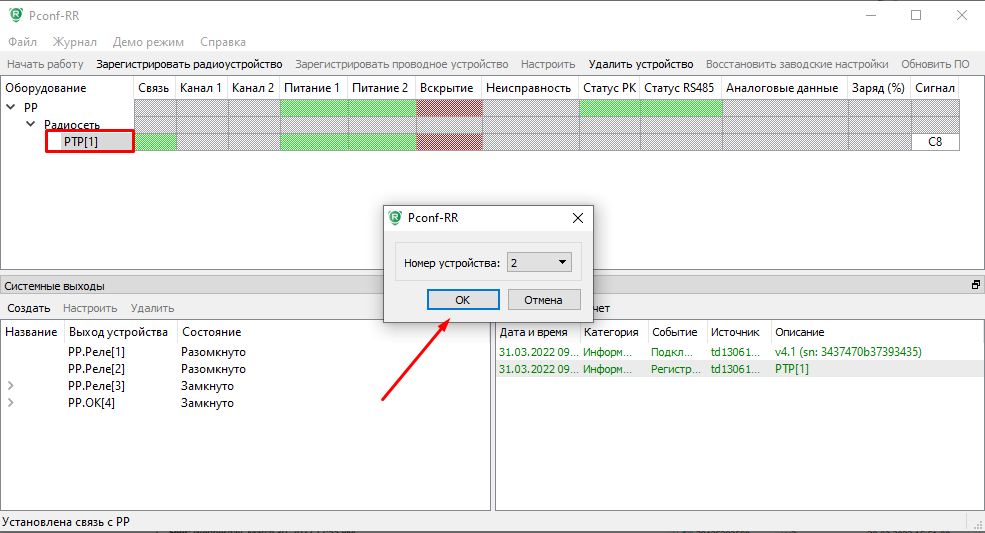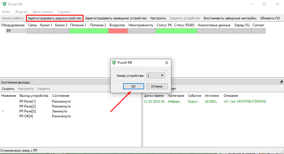 В интерфейсе программы выбрать устройство РР и нажать функциональную кнопку "Зарегистрировать радиоустройство"