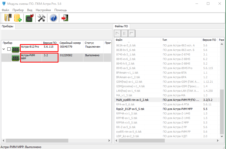 По завершении процесса, Астра-812Pro версия ПО - 5.6.115; Астра-РИМ МРР версия ПО - 3.2