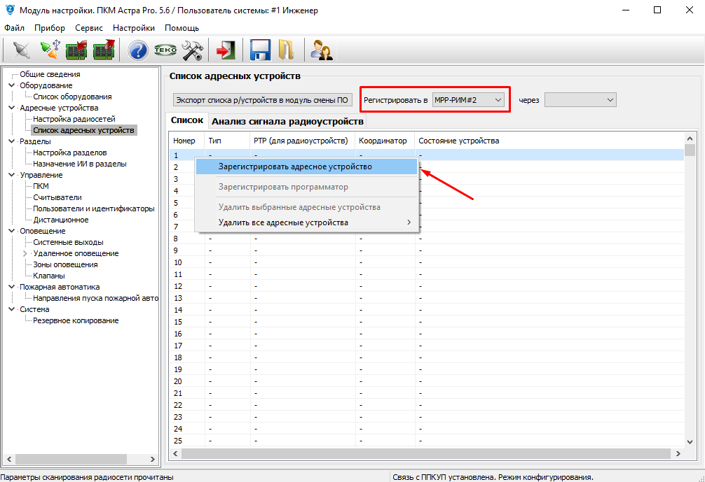 В меню «Адресные устройства» - «Список адресных устройств», выбрать регистрировать в «МРР-РИМ#2»