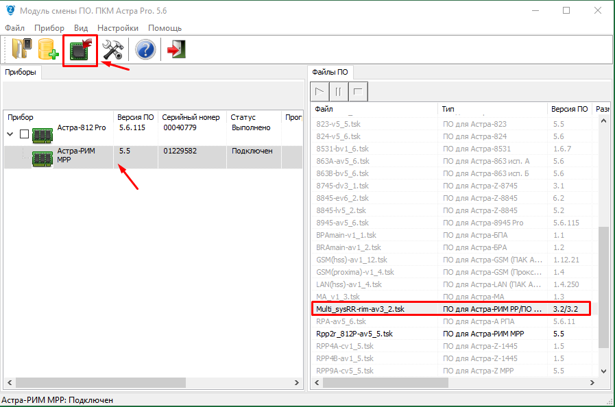 Выделить радиорасширитель Астра-РИМ МРР, отобразятся доступный файлы ПО, выбрать файл Multi_sysRR-rim-av3.2.tsk и запустить процесс записи файла ПО (пароль инженера 123456)