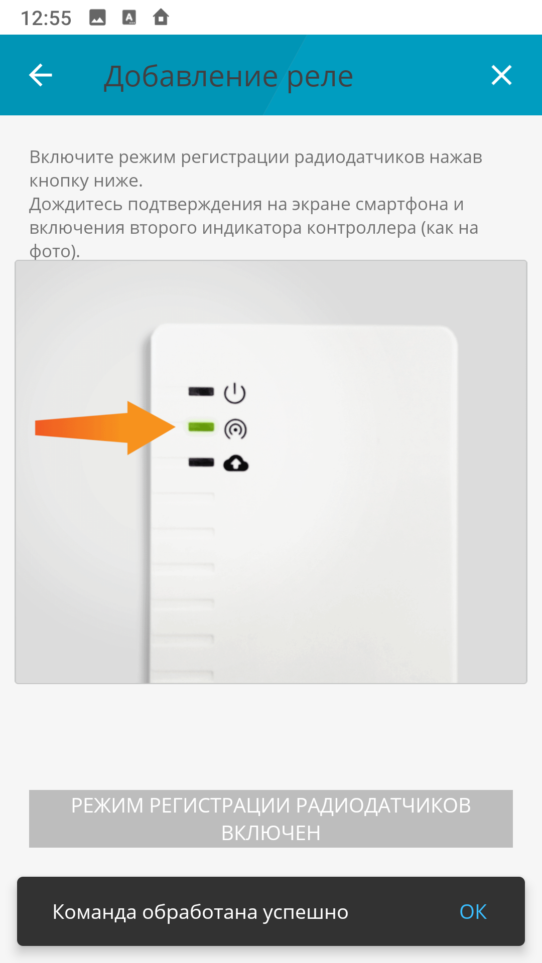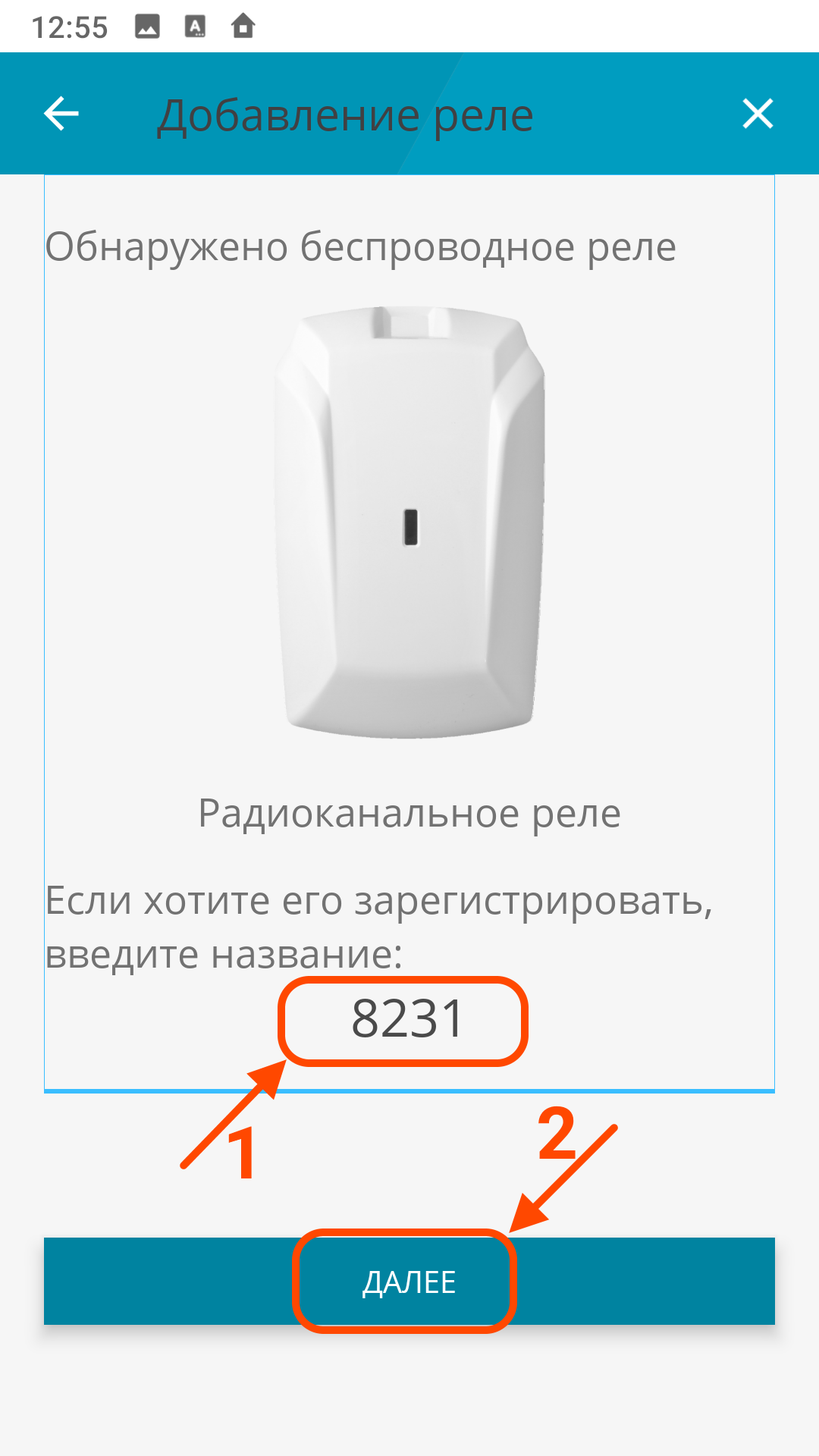 | Включите режим регистрации | Вставьте элемент питания в реле "Астра-8231" | При успешном обнаружении предлагается ввести название реле |