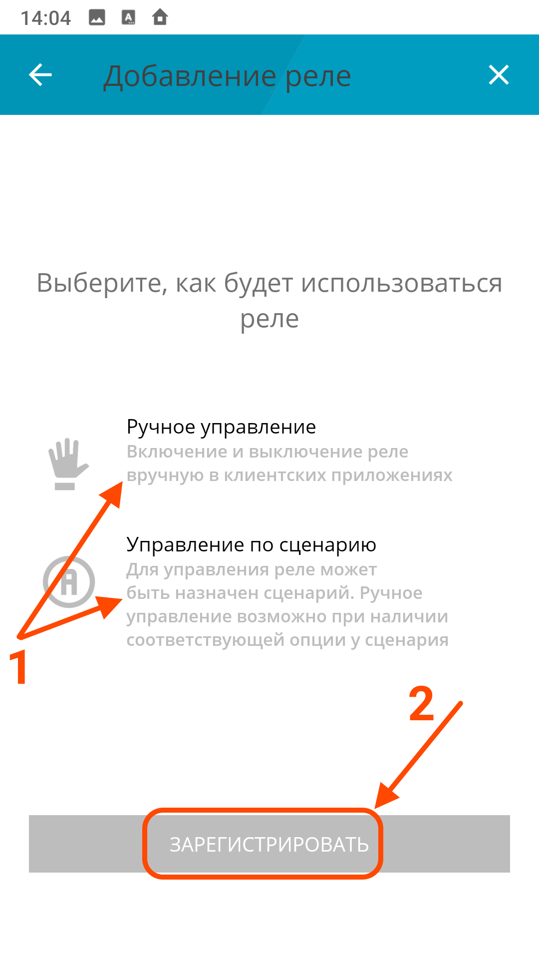 В процессе добавления реле нужно выбрать, как оно будет использоваться (см рис.6). Если необходимо простое переключение из мобильного приложения (Триггер), то выбрать "Ручное управление". Если нужна более сложная автоматизация с применением сценариев, то выбрать "Управление по сценарию".