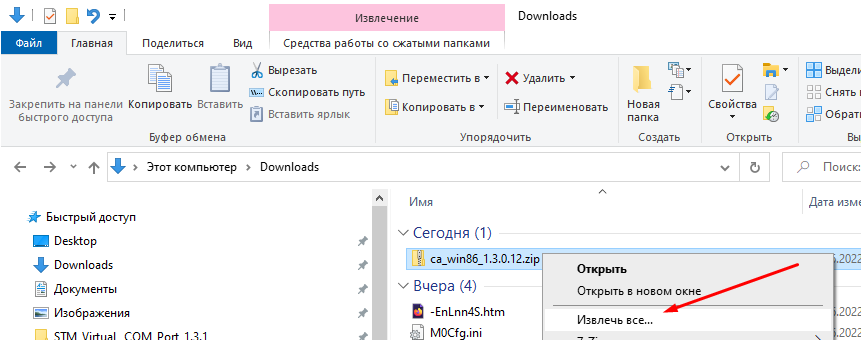 4. В открывшейся папке, распаковать архив, нажав правой кнопкой мыши по архиву и выбрать «Извлечь всё».