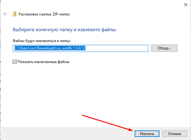 5. В появившемся окне укажите желаемый путь куда будет распакован архив. Завершить распаковку архива нажав кнопку «Извлечь».